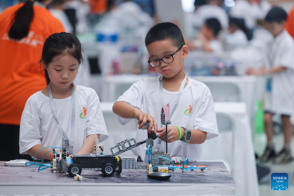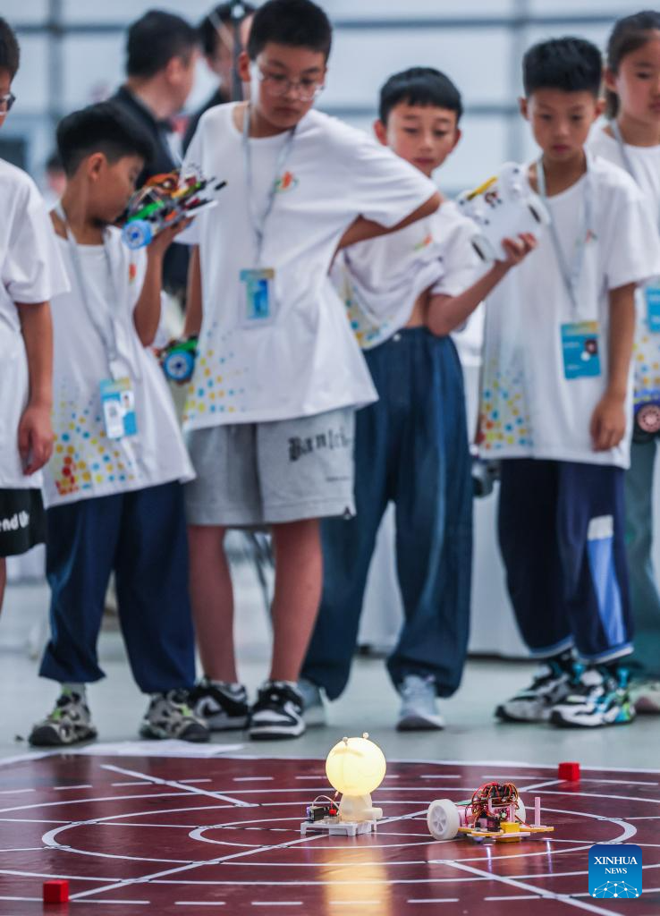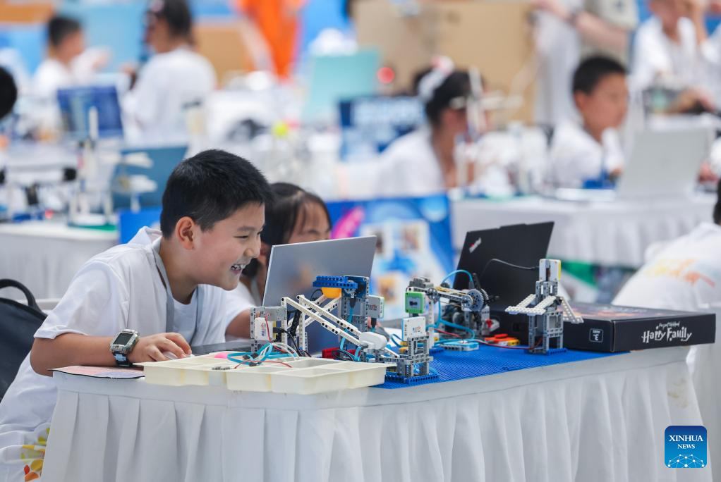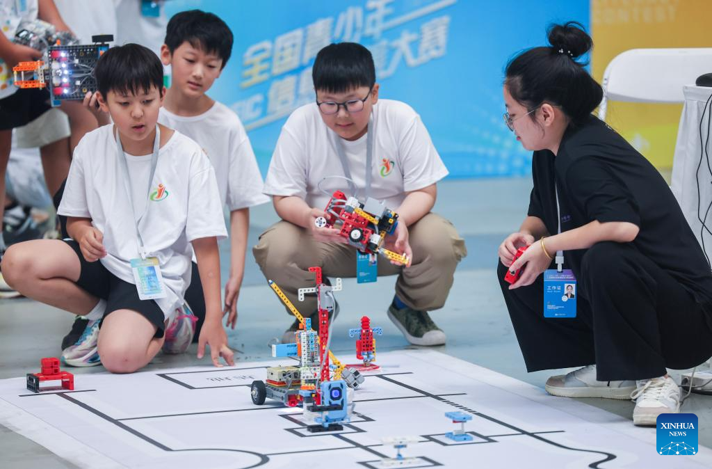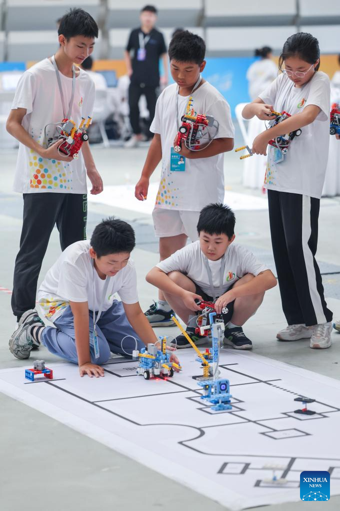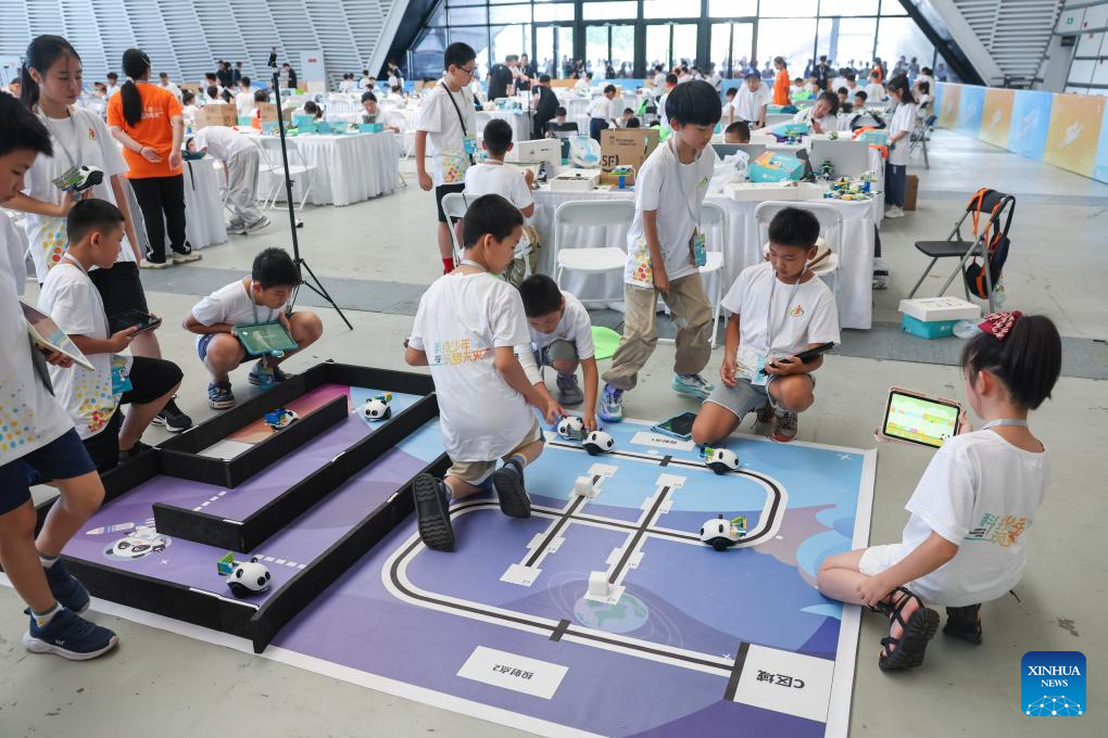 Contestants are pictured in a "smart planet" challenge competition during the finals of the China Youth Electronic & Information Literacy Contest in Tongxiang City, east China's Zhejiang Province, Aug. 20, 2025. The finals of the contest kicked off here on Tuesday and will last until Aug. 24. More than 28,000 contestants nationwide will compete in 20 events in three major fields including intelligent application, algorithmic thinking, and independent innovation. (Xinhua/Xu Yu)