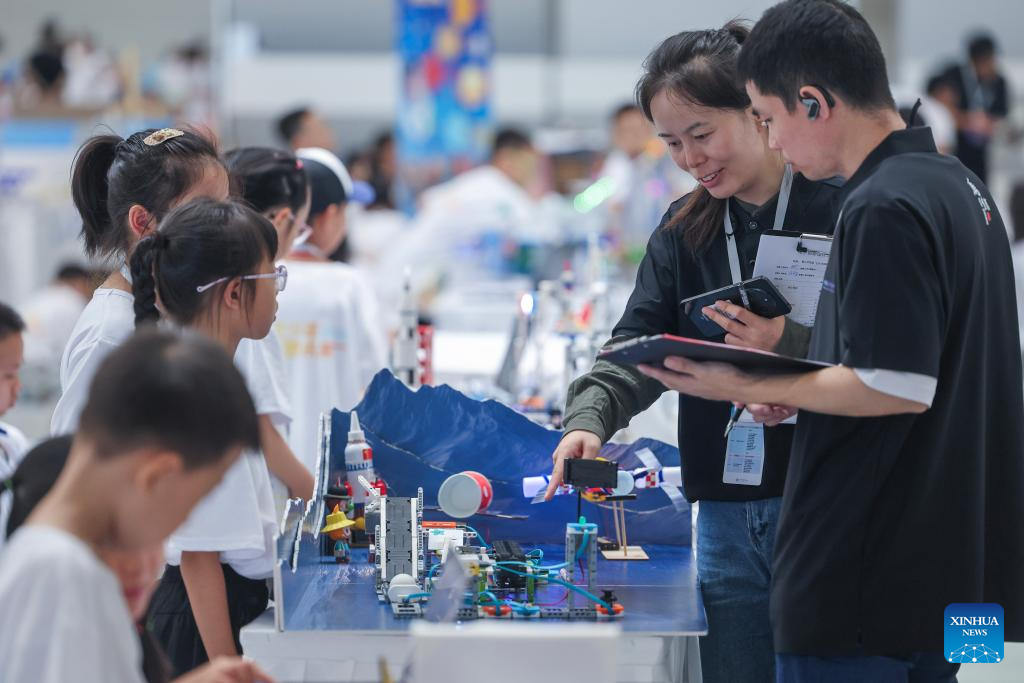 Contestants are pictured in a "survival on Mars" challenge competition during the finals of the China Youth Electronic & Information Literacy Contest in Tongxiang City, east China's Zhejiang Province, Aug. 20, 2025. The finals of the contest kicked off here on Tuesday and will last until Aug. 24. More than 28,000 contestants nationwide will compete in 20 events in three major fields including intelligent application, algorithmic thinking, and independent innovation. (Xinhua/Xu Yu)