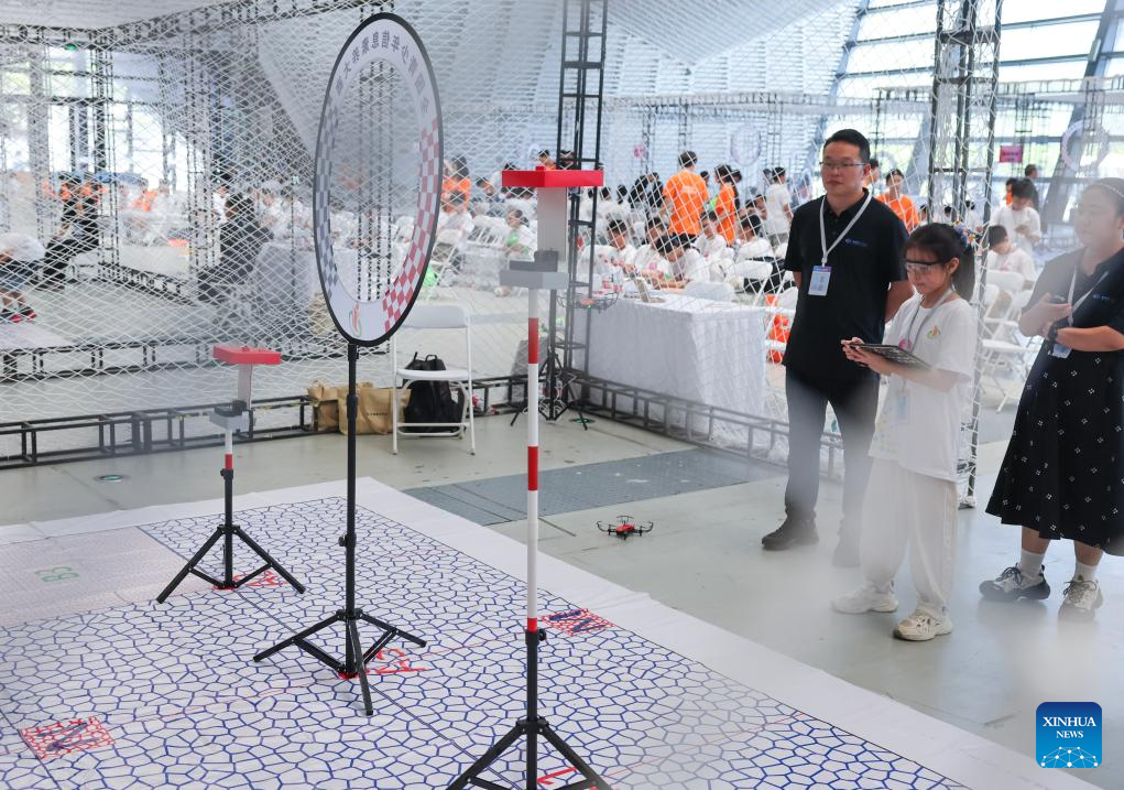 A contestant is pictured in a UAV themed competition during the finals of the China Youth Electronic & Information Literacy Contest in Tongxiang City, east China's Zhejiang Province, Aug. 20, 2025. The finals of the contest kicked off here on Tuesday and will last until Aug. 24. More than 28,000 contestants nationwide will compete in 20 events in three major fields including intelligent application, algorithmic thinking, and independent innovation. (Xinhua/Xu Yu)