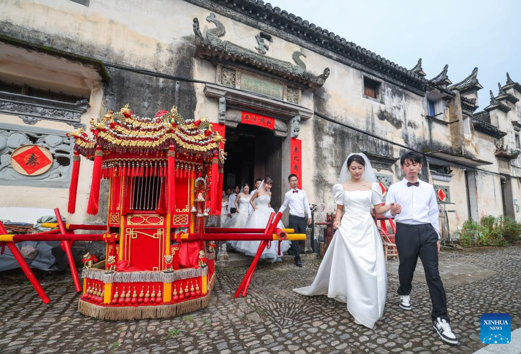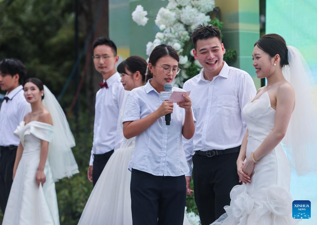 Couples participate in a group wedding ceremony during a folk culture activity in Dongbaihu Town of Zhuji City, east China's Zhejiang Province, Aug. 20, 2025. A series of folk culture and tourism activities were held here in celebration of the upcoming traditional Qixi Festival, known as Chinese Valentine's Day. (Xinhua/Xu Yu)