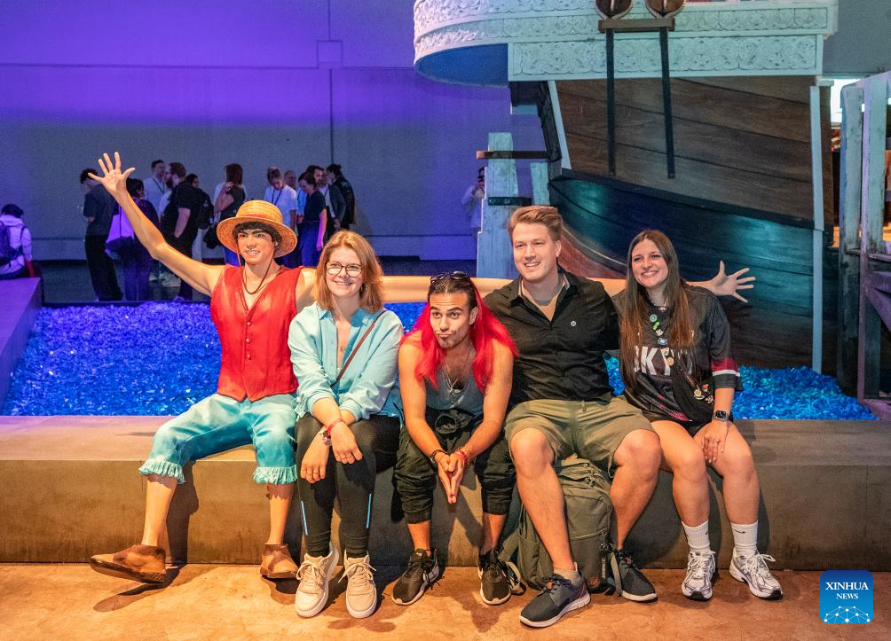 People pose for pictures with a giant model at Gamescom 2025 in Cologne, Germany, on Aug. 20, 2025. Gamescom 2025, one of the world's largest trade fairs for computer and video games, kicked off here on Wednesday with a record 1,500 exhibitors, highlighting both the industry's global reach and the growing footprint of Chinese developers. (Xinhua/Zhang Fan)