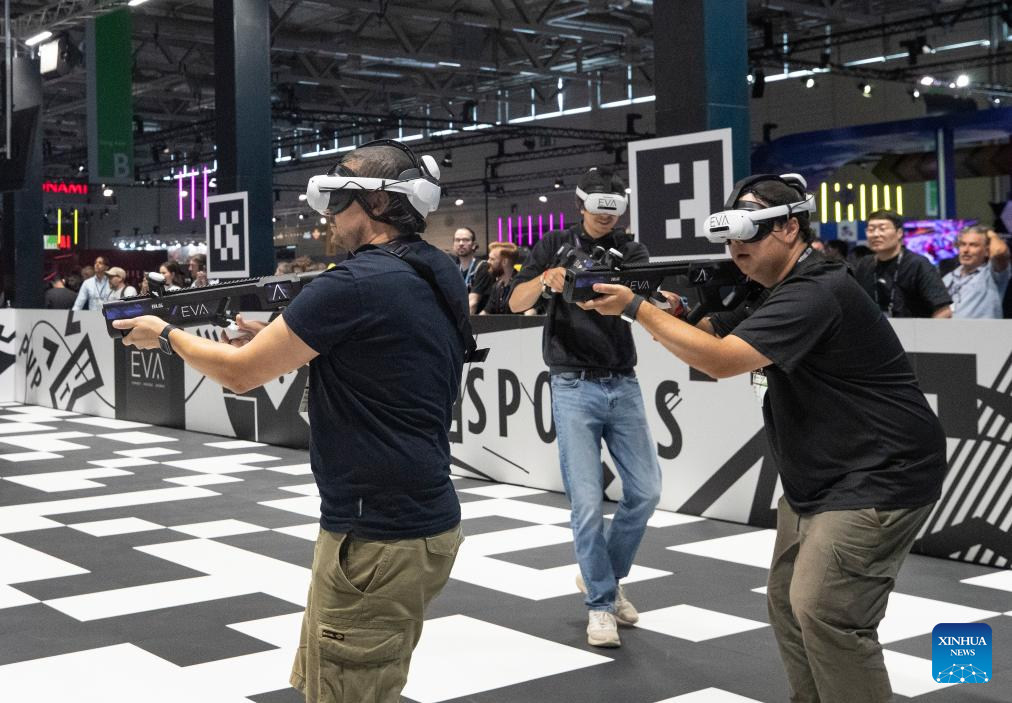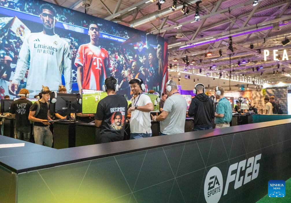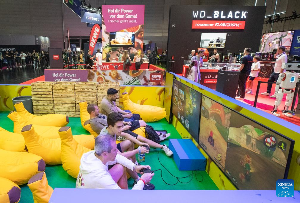 People try games at Gamescom 2025 in Cologne, Germany, on Aug. 20, 2025. Gamescom 2025, one of the world's largest trade fairs for computer and video games, kicked off here on Wednesday with a record 1,500 exhibitors, highlighting both the industry's global reach and the growing footprint of Chinese developers. (Xinhua/Zhang Fan)