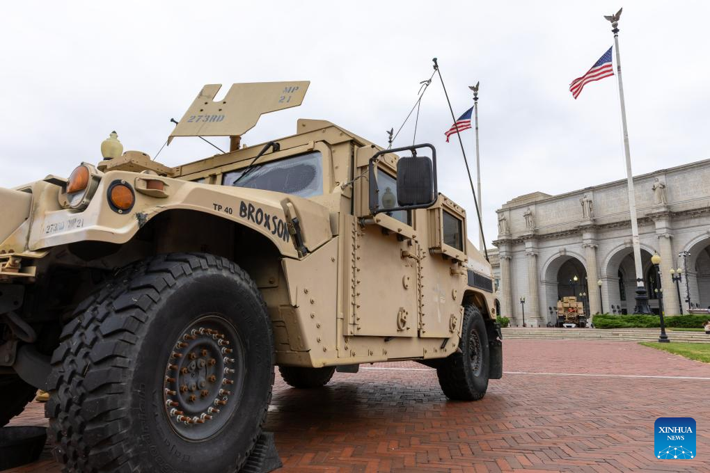 This photo taken on Aug. 19, 2025 shows a National Guard vehicle parked in front of Union Station in Washington, D.C., the United States. The U.S. state of Tennessee announced Tuesday that it is sending around 160 National Guard troops to Washington, D.C., after U.S. President Donald Trump asserted that crime and homelessness have been out of control in the nation's capital. (Xinhua/Hu Yousong)