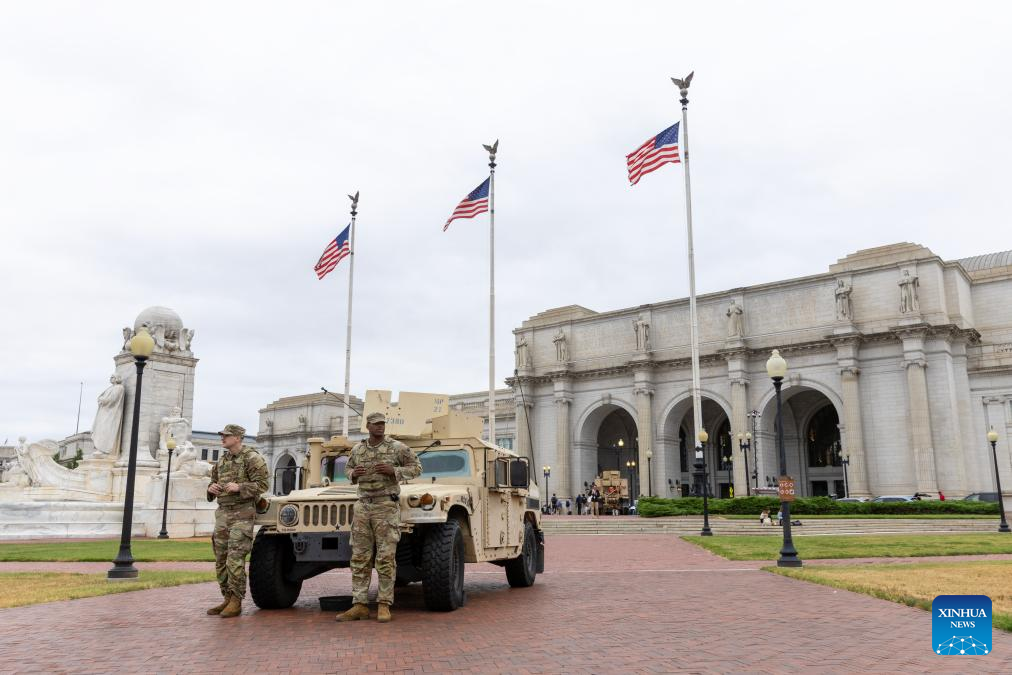 Members of the National Guard patrol outside Union Station in Washington, D.C., the United States, on Aug. 19, 2025. The U.S. state of Tennessee announced Tuesday that it is sending around 160 National Guard troops to Washington, D.C., after U.S. President Donald Trump asserted that crime and homelessness have been out of control in the nation's capital. (Xinhua/Hu Yousong)