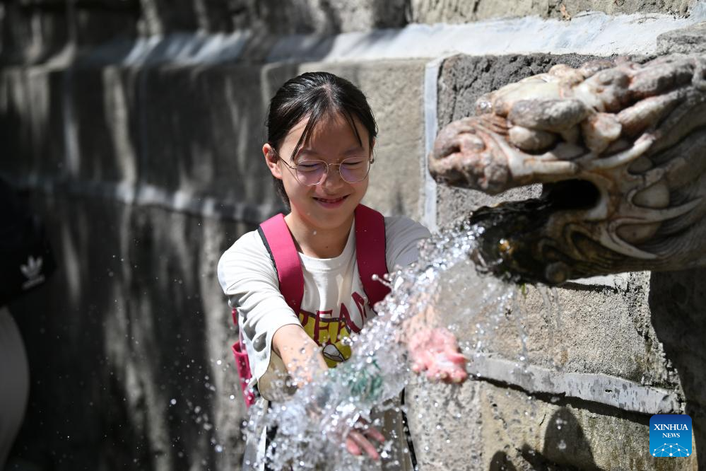 TAIYUAN, Aug. 20 (Xinhua) -- At an outlet of the Nanlao Spring in Jinci Temple in north China, crystal-clear water poured from a weathered stone dragon's mouth, sparkling in the sunlight as visitors jostled to capture its fleeting cascade.