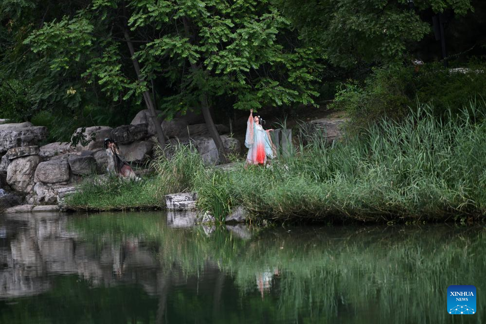 A visitor poses for photos at Jinci Temple in Taiyuan, north China's Shanxi Province, Aug. 7, 2025. (Xinhua/Zhan Yan)