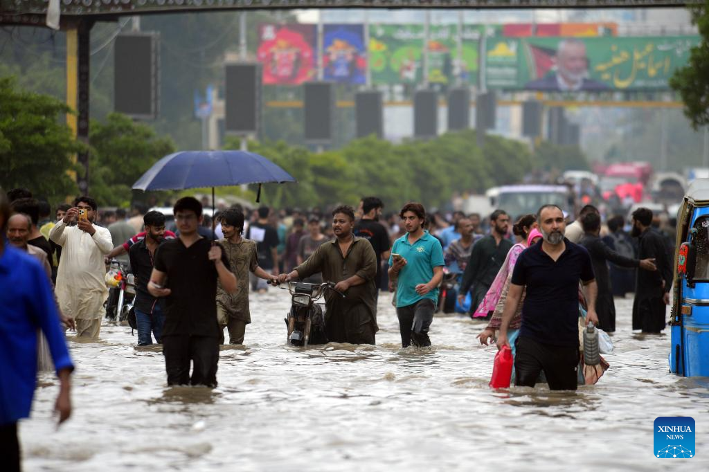 People wade through a flooded street after heavy monsoon rain in Karachi, Pakistan, on Aug. 19, 2025. (Str/Xinhua)
