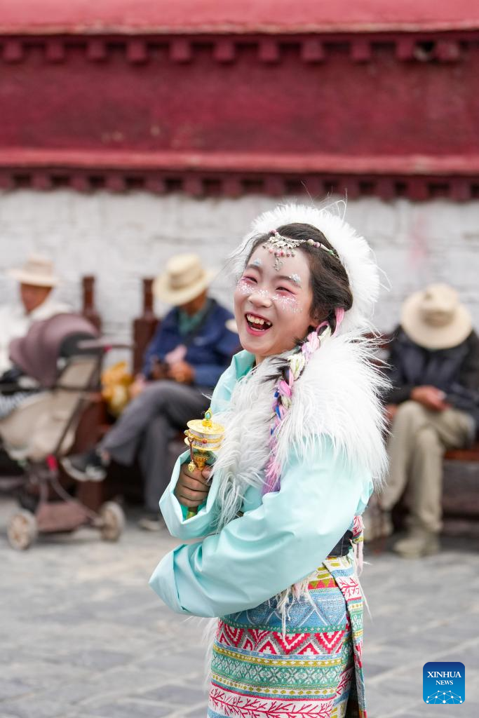 A tourist wearing Tibetan costumes poses for photos at the ancient city of Lhasa, southwest China's Xizang Autonomous Region, Aug. 19, 2025. (Xinhua/Jigme Dorje)