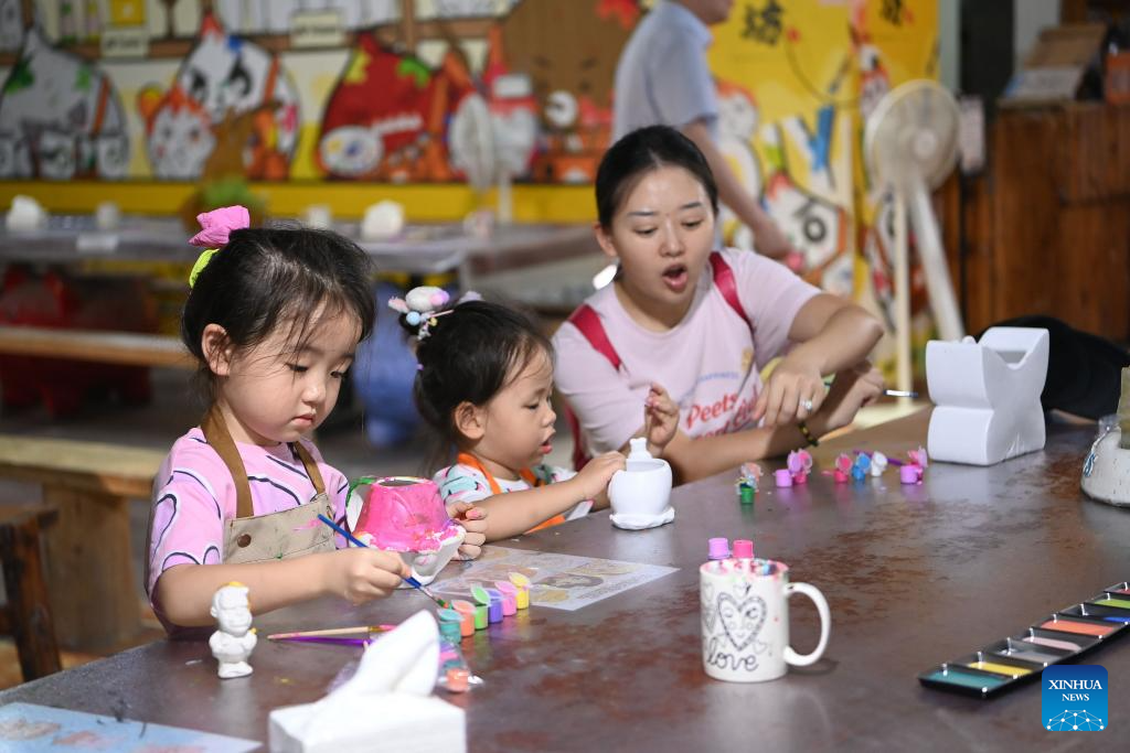 People engage in porcelain coloring experience at Quanzhou Shunmei Group Co., Ltd. in Dehua County, southeast China's Fujian Province, Aug. 20, 2025. Dehua, a county with centuries of ceramic-making history and famed for its white porcelain, is home to over 4,500 ceramic-making enterprises, selling products to more than 190 countries and regions worldwide. To promote Dehua ceramics, the county has established 54 exhibition centers in Belt and Road partner countries and key cities. From January to July this year, the county's ceramic exports has exceeded 2.138 billion yuan (about 297.9 million U.S. dollars) and the ceramic industry cluster has reached a scale of 41.61 billion yuan (about 5.797 billion U.S. dollars), representing a 5.06 percent and 6.8 percent year-on-year increase respectively. (Xinhua/Xiao Xiao)