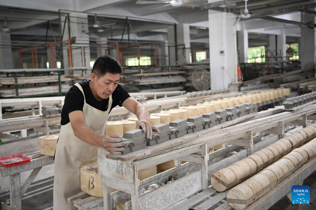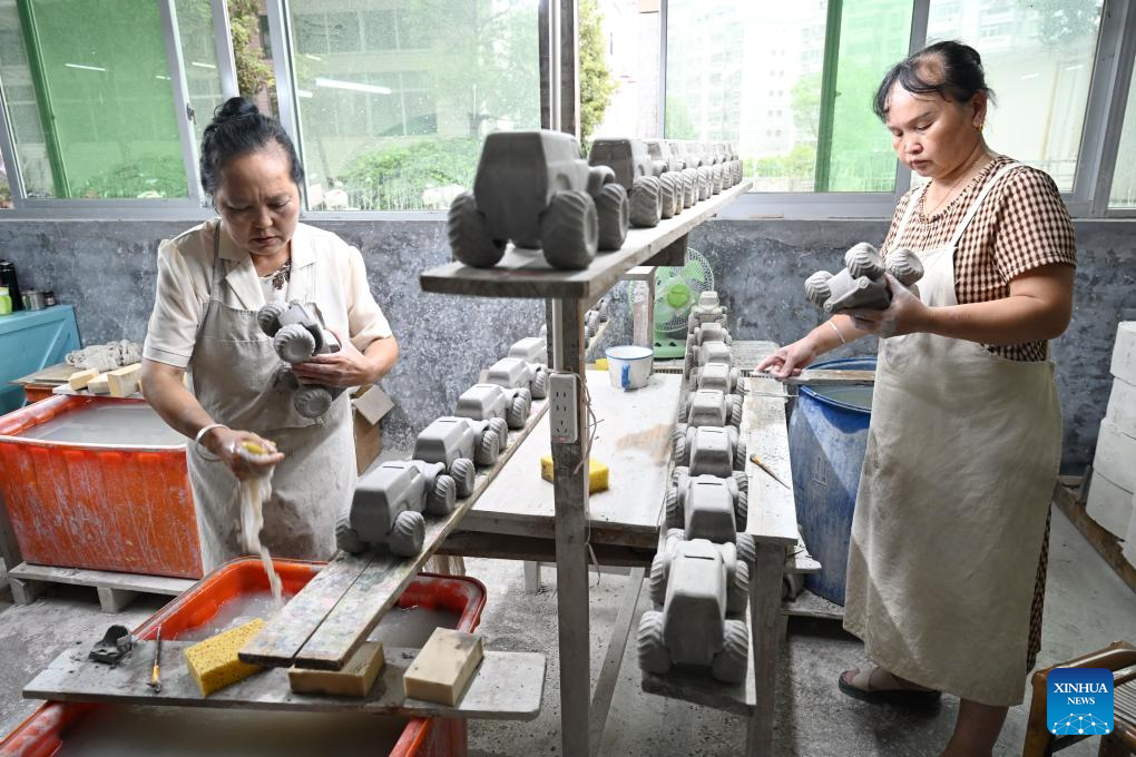 Workers operate at a workshop of Quanzhou Shunmei Group Co., Ltd. in Dehua County, southeast China's Fujian Province, Aug. 20, 2025. Dehua, a county with centuries of ceramic-making history and famed for its white porcelain, is home to over 4,500 ceramic-making enterprises, selling products to more than 190 countries and regions worldwide. To promote Dehua ceramics, the county has established 54 exhibition centers in Belt and Road partner countries and key cities. From January to July this year, the county's ceramic exports has exceeded 2.138 billion yuan (about 297.9 million U.S. dollars) and the ceramic industry cluster has reached a scale of 41.61 billion yuan (about 5.797 billion U.S. dollars), representing a 5.06 percent and 6.8 percent year-on-year increase respectively. (Xinhua/Xiao Xiao)
