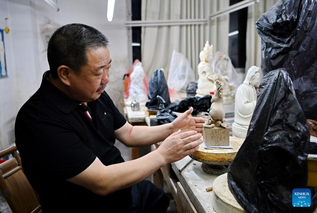 Lin Jiansheng, a master of Chinese arts and crafts, introduces the processes of making a white porcelain artwork at his studio in Dehua County, southeast China's Fujian Province, Aug. 20, 2025. Dehua, a county with centuries of ceramic-making history and famed for its white porcelain, is home to over 4,500 ceramic-making enterprises, selling products to more than 190 countries and regions worldwide. To promote Dehua ceramics, the county has established 54 exhibition centers in Belt and Road partner countries and key cities. From January to July this year, the county's ceramic exports has exceeded 2.138 billion yuan (about 297.9 million U.S. dollars) and the ceramic industry cluster has reached a scale of 41.61 billion yuan (about 5.797 billion U.S. dollars), representing a 5.06 percent and 6.8 percent year-on-year increase respectively. (Xinhua/Xiao Xiao)