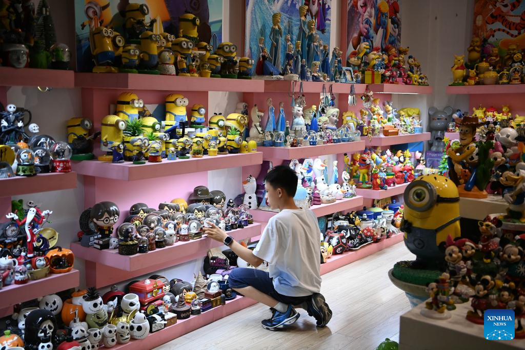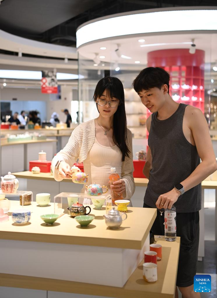 People visit the porcelain e-commerce logistics park in Dehua County, southeast China's Fujian Province, Aug. 20, 2025. Dehua, a county with centuries of ceramic-making history and famed for its white porcelain, is home to over 4,500 ceramic-making enterprises, selling products to more than 190 countries and regions worldwide. To promote Dehua ceramics, the county has established 54 exhibition centers in Belt and Road partner countries and key cities. From January to July this year, the county's ceramic exports has exceeded 2.138 billion yuan (about 297.9 million U.S. dollars) and the ceramic industry cluster has reached a scale of 41.61 billion yuan (about 5.797 billion U.S. dollars), representing a 5.06 percent and 6.8 percent year-on-year increase respectively. (Xinhua/Xiao Xiao)