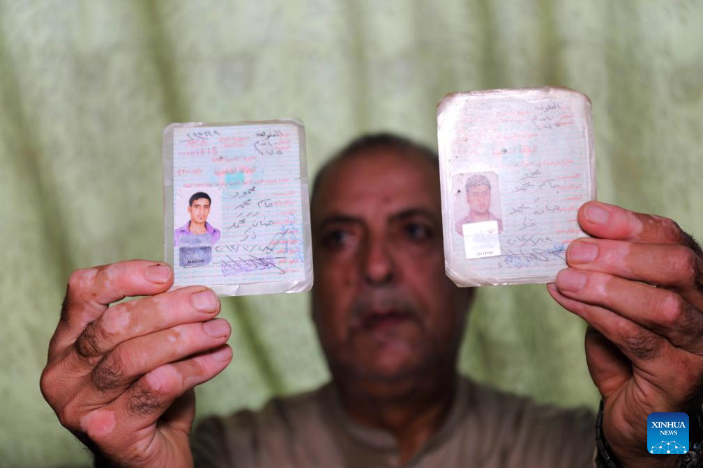 Jasim Mohammed Al-Jumaili shows the ID cards of his two sons kidnapped by the Islamic State (IS) in Fallujah, Iraq, on Aug. 16, 2025. (Xinhua/Khalil Dawood)