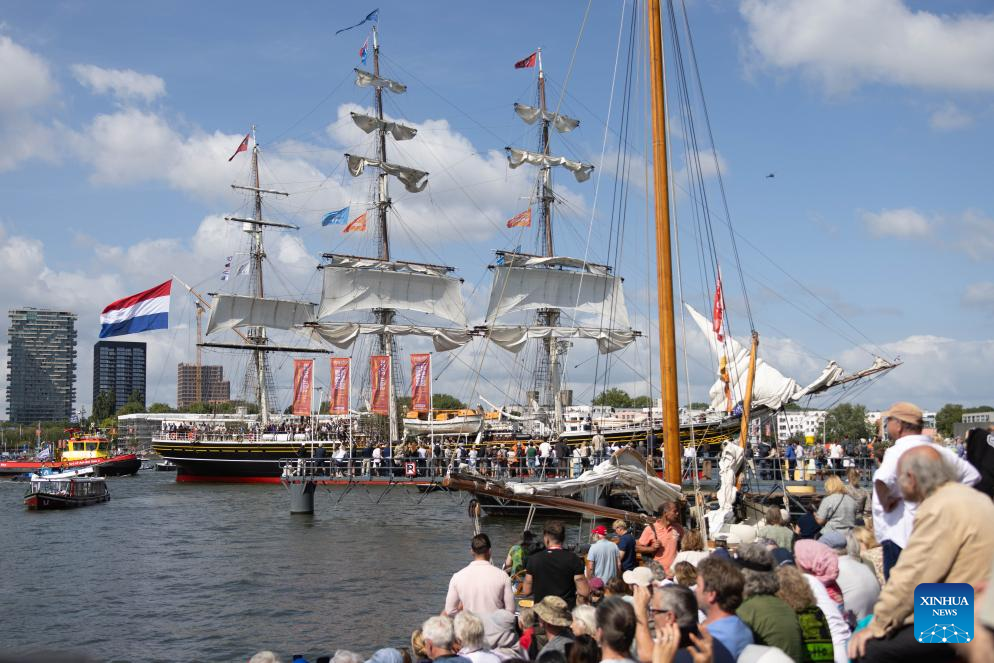 A tall ship sails into Amsterdam, the Netherlands, on Aug. 20, 2025. Sail Amsterdam, the Netherlands' major maritime festival first held 50 years ago, kicked off its 10th edition on Wednesday after a decade-long break. (Photo by Sylvia Lederer/Xinhua)
