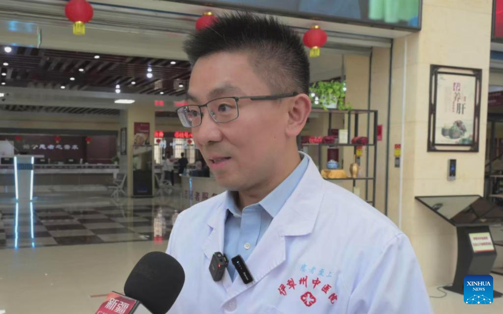 Dr. Wei Yunfei, deputy director at the Ili Hospital of Traditional Chinese Medicine, briefs on Jiangsu's medical aid efforts in Ili Kazak Autonomous Prefecture, northwest China's Xinjiang Uygur Autonomous Region, Aug. 17, 2025. (Photo by Zhang Lifeng/Xinhua)