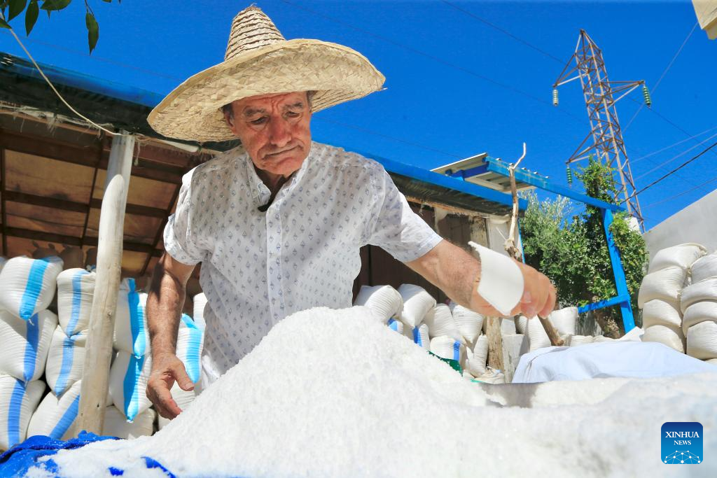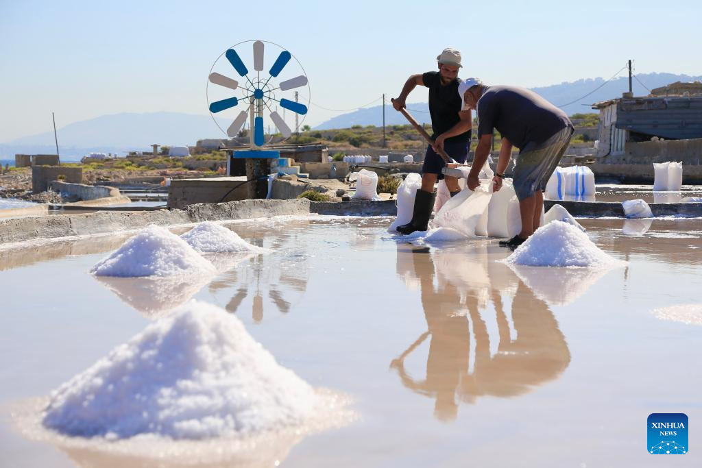 Workers produce salt through traditional sun-drying methods in Anfeh, Lebanon, Aug. 20, 2025. (Photo by Ali Hashisho/Xinhua)