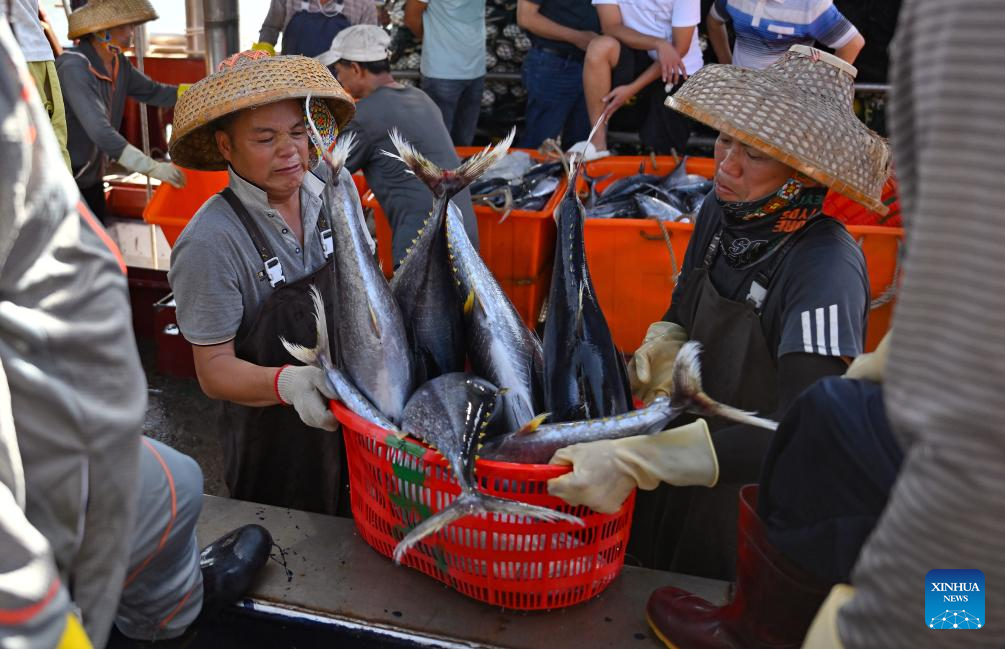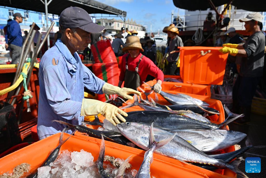 Fishermen unload the catches at a fishing port in Wenchang, south China's Hainan Province, Aug. 21, 2025.