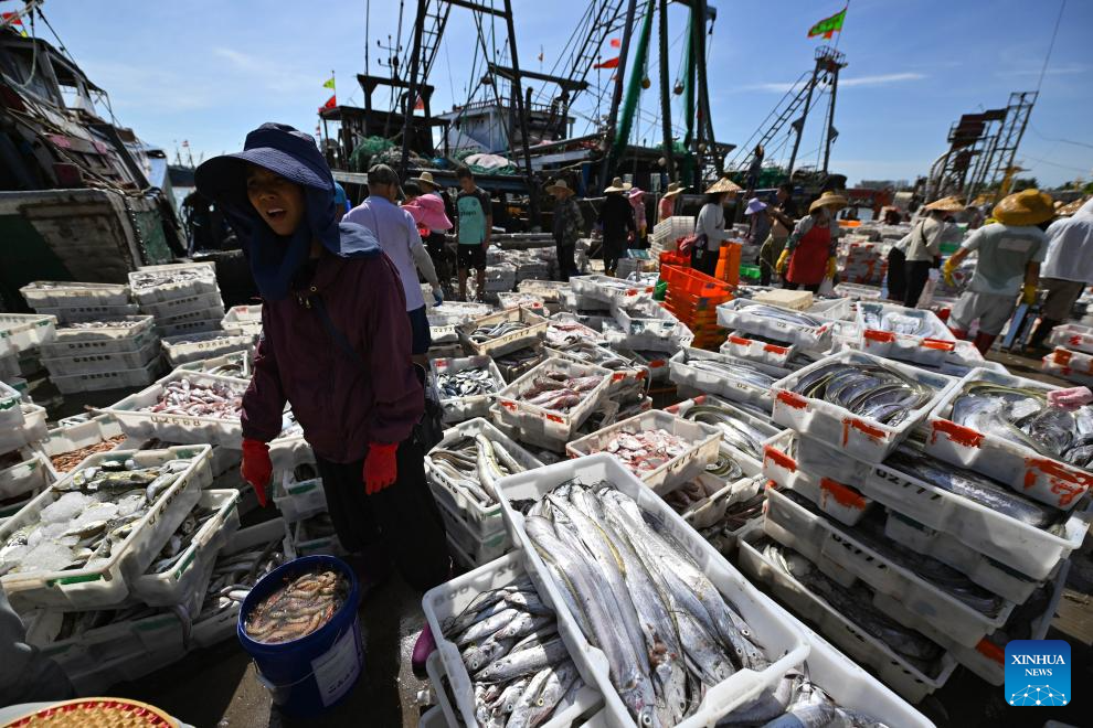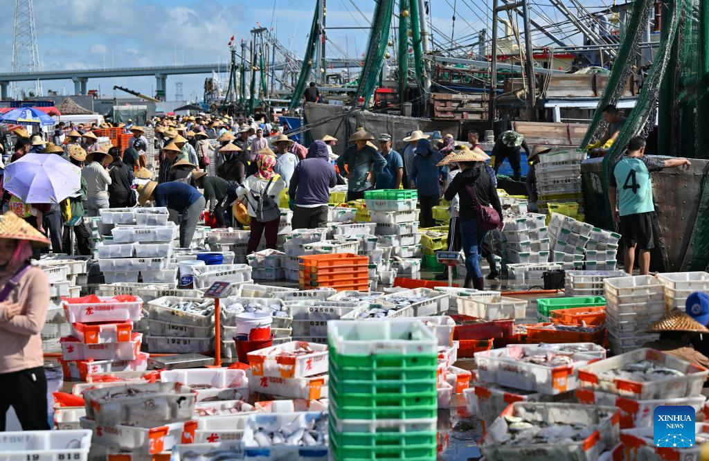 Fish catches are unloaded and traded at a fishing port in Wenchang, south China's Hainan Province, Aug. 21, 2025.
