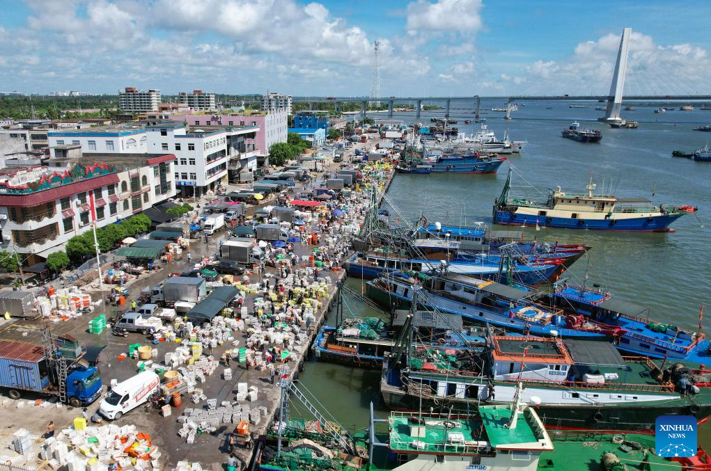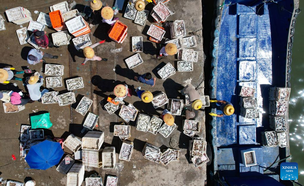 A drone photo shows fish catches being unloaded and traded at a fishing port in Wenchang, south China's Hainan Province, Aug. 21, 2025.