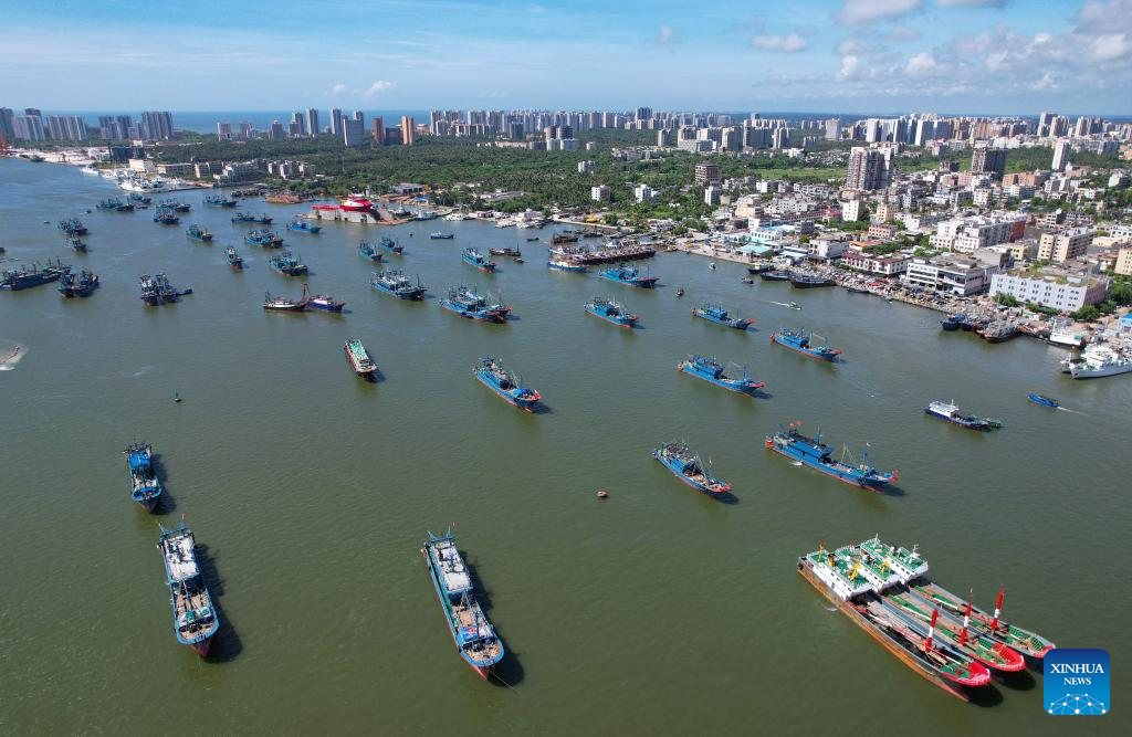 An aerial drone photo shows fishing vessels waiting to dock at a fishing port in Wenchang, south China's Hainan Province, Aug. 21, 2025.
