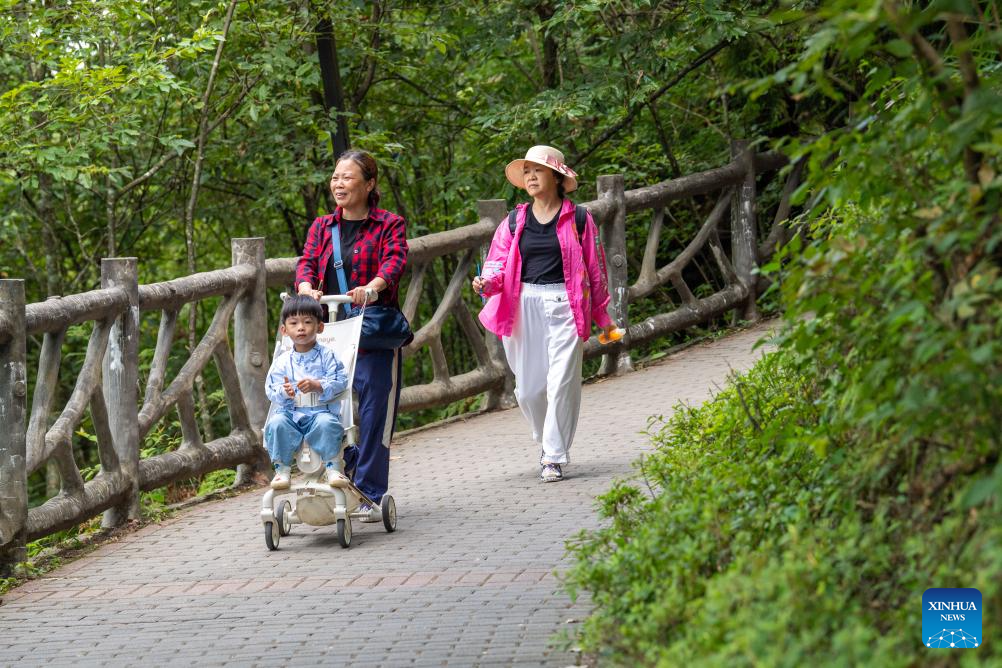Tourists take a walk in Huangshui Town of Shizhu County, southwest China's Chongqing Municipality, Aug. 21, 2025. Huangshui has turned itself into a well noted tourist destination by taking full advantage of local forest and landscape resources. So far this year, the town has received 16 million visitors, who brought in a combined revenue of 11.2 billion yuan (1.56 billion U.S. dollars). (Xinhua/Tang Yi)