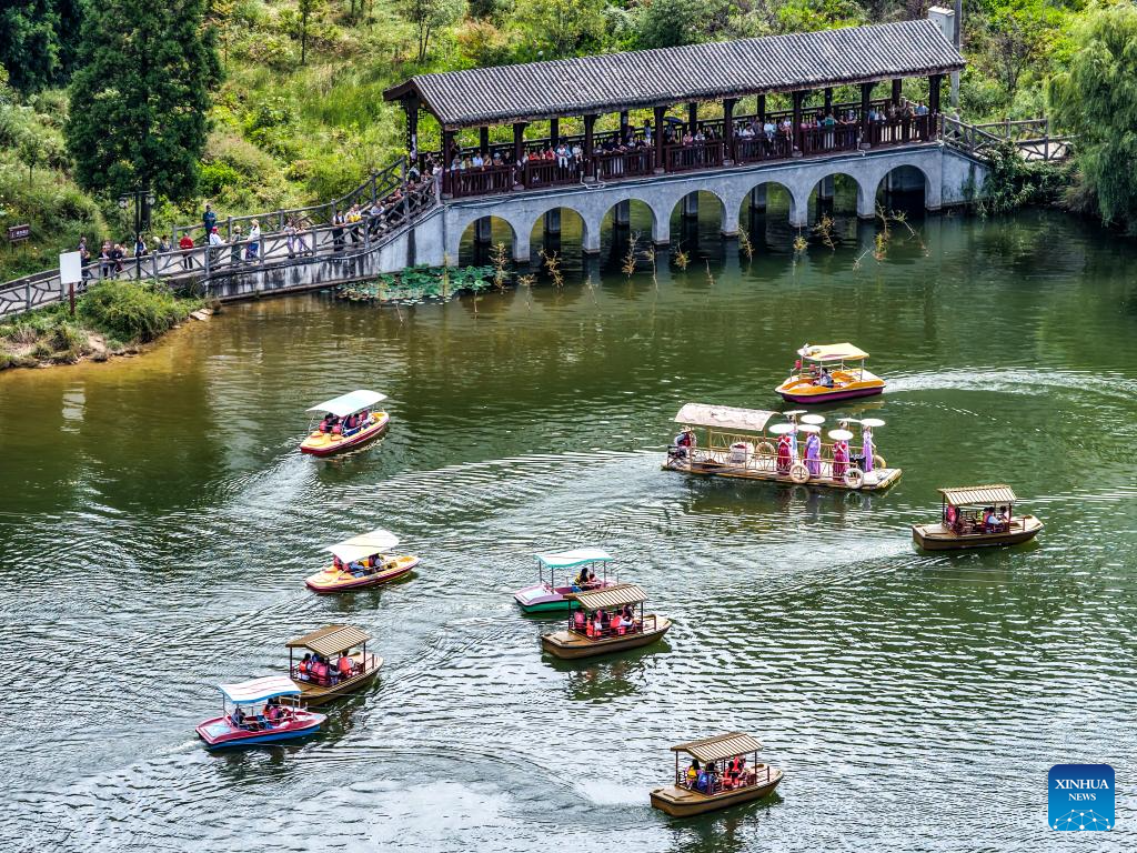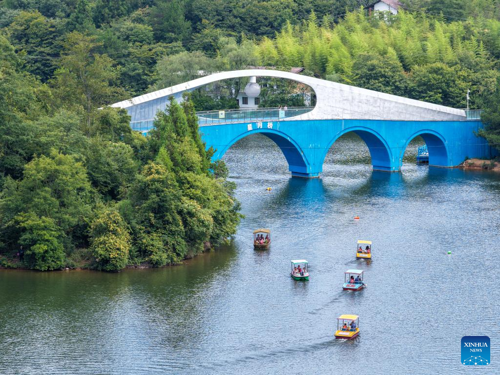 An aerial drone photo shows tourists taking boats on a lake in Huangshui Town of Shizhu County, southwest China's Chongqing Municipality, Aug. 21, 2025. Huangshui has turned itself into a well noted tourist destination by taking full advantage of local forest and landscape resources. So far this year, the town has received 16 million visitors, who brought in a combined revenue of 11.2 billion yuan (1.56 billion U.S. dollars). (Xinhua/Tang Yi)