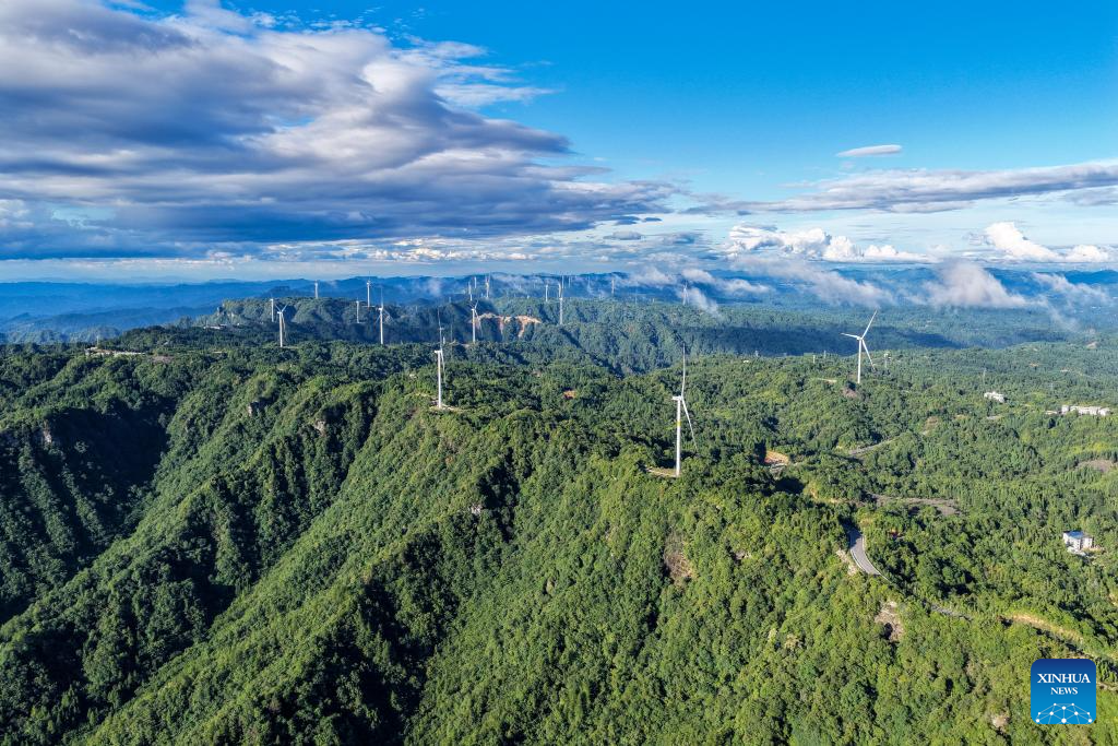 An aerial drone photo shows the scenery of Huangshui Town in Shizhu County, southwest China's Chongqing Municipality, Aug. 21, 2025. Huangshui has turned itself into a well noted tourist destination by taking full advantage of local forest and landscape resources. So far this year, the town has received 16 million visitors, who brought in a combined revenue of 11.2 billion yuan (1.56 billion U.S. dollars). (Xinhua/Tang Yi)