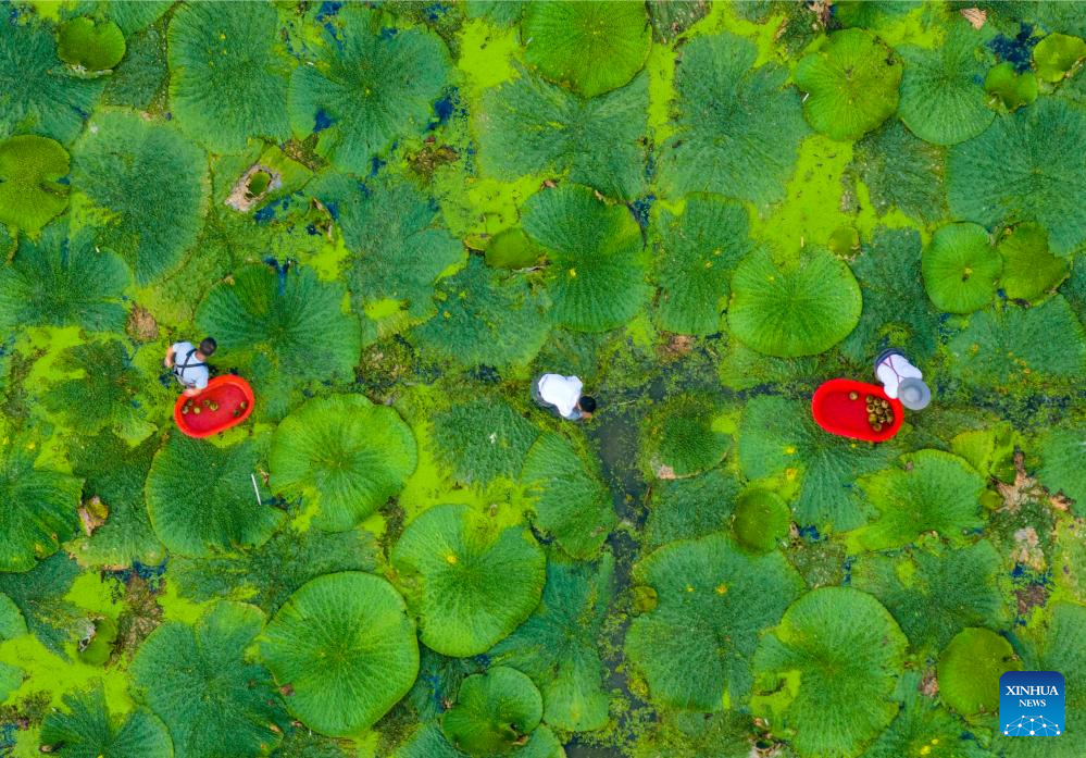 An aerial drone photo taken on Aug. 22, 2025 shows farmers harvesting Gordon Euryale seeds in Huisheng Village of Dongxing Town of Jingjiang City, east China's Jiangsu Province. As the Chushu of the solar terms is approaching, farmers across the country are busy working in fields. (Photo by Tang Dehong/Xinhua)