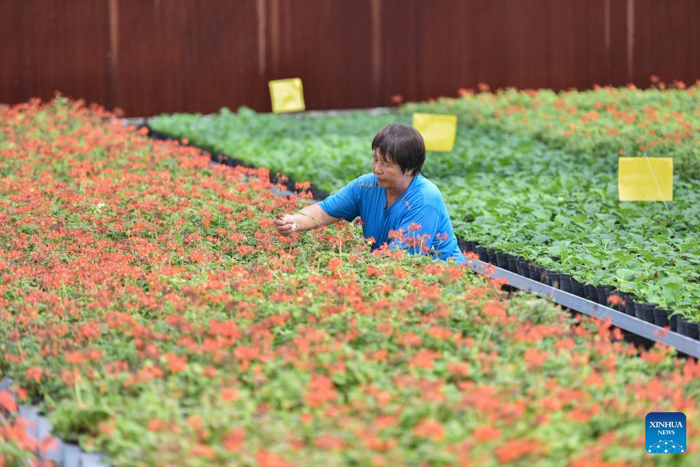 A farmer tends flowers in Dongjiande Village of Qingzhou City, east China's Shandong Province, Aug. 22, 2025. As the Chushu of the solar terms is approaching, farmers across the country are busy working in fields. (Photo by Wang Jilin/Xinhua)