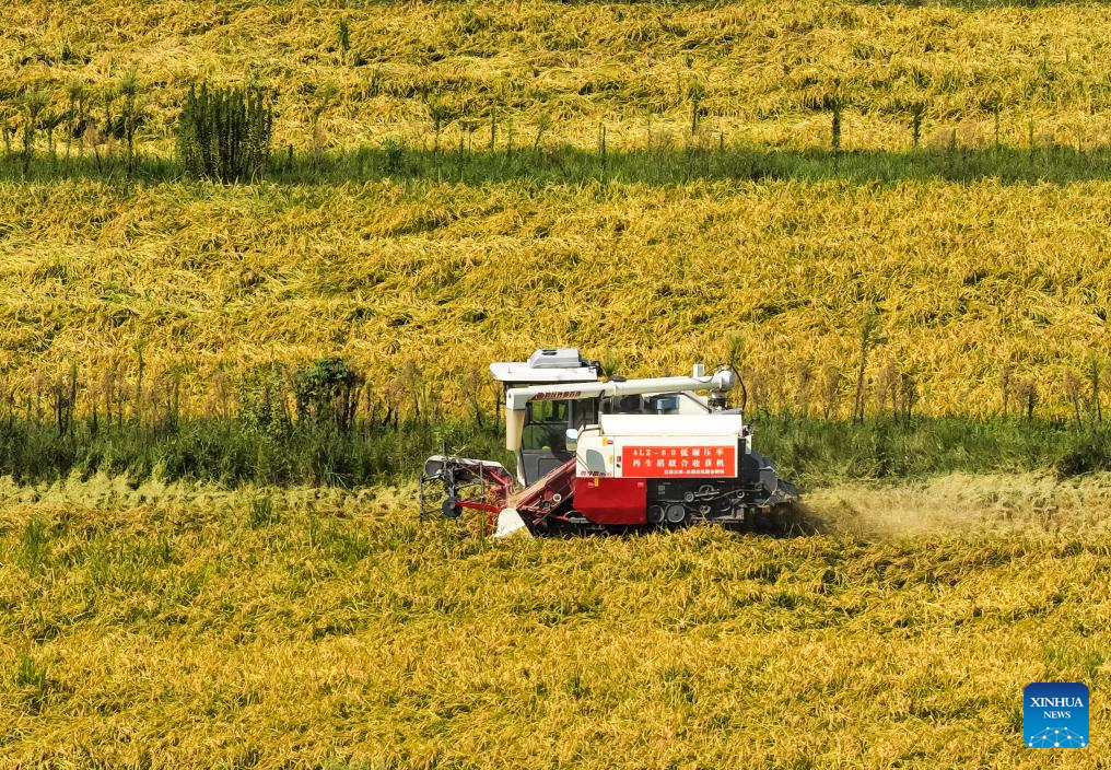 An aerial drone photo taken on Aug. 22, 2025 shows a reaper harvesting rice in a field in Daoxian County of Yongzhou City, central China's Hunan Province. As the Chushu of the solar terms is approaching, farmers across the country are busy working in fields. (Photo by Jiang Keqing/Xinhua)