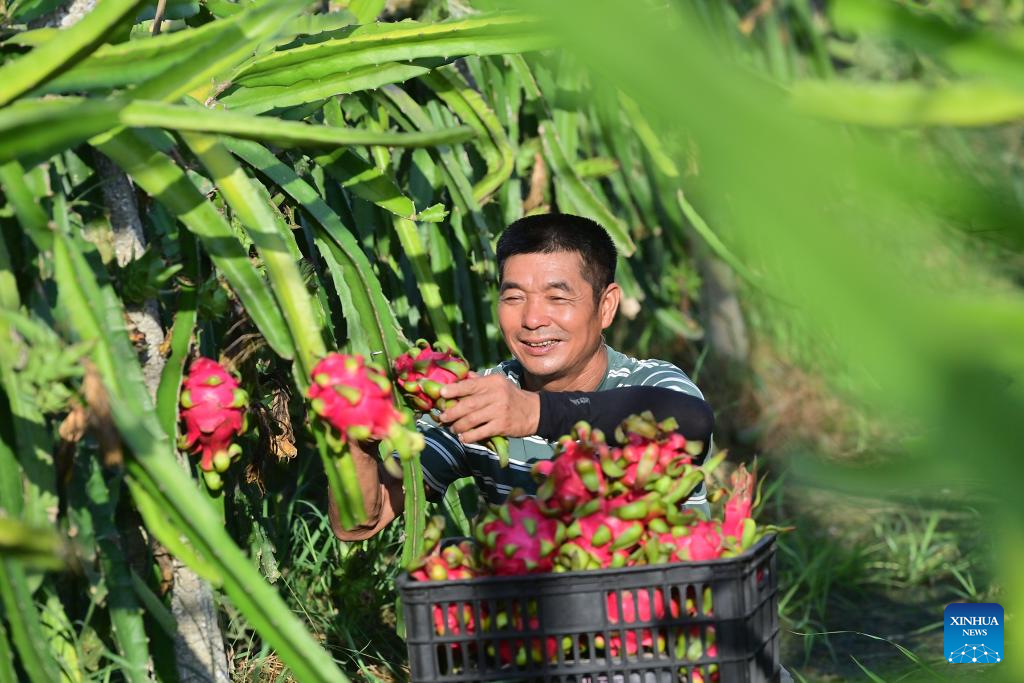 A farmer harvests pitayas at a planting base in Wanzai County of Yichun City, east China's Jiangxi Province, Aug. 22, 2025. As the Chushu of the solar terms is approaching, farmers across the country are busy working in fields. (Photo by Deng Longhua/Xinhua)