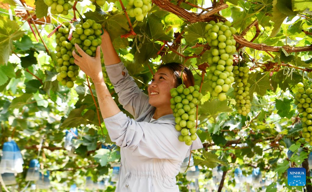 A farmer harvests grapes in Taierzhuang District of Zaozhuang City, east China's Shandong Province, Aug. 22, 2025. As the Chushu of the solar terms is approaching, farmers across the country are busy working in fields. (Photo by Jia Lizhang/Xinhua)
