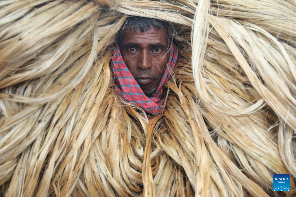 A worker carries jute at a jute market in Manikganj, Bangladesh on Aug. 20, 2025. (Photo by Habibur Rahman/Xinhua)