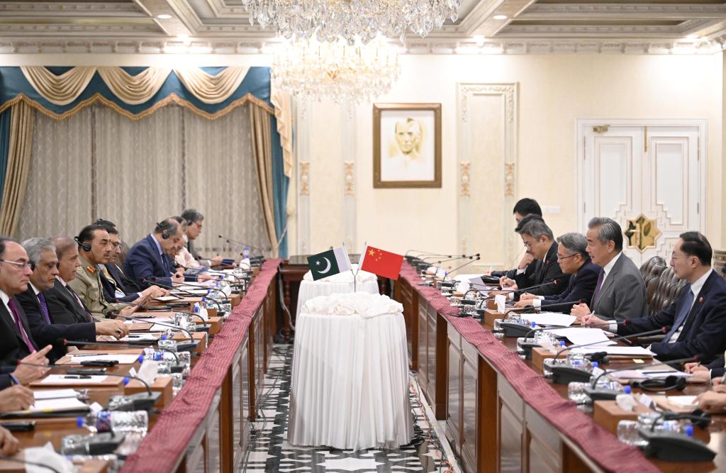 Pakistani Prime Minister Shehbaz Sharif meets with visiting Chinese Foreign Minister Wang Yi, also a member of the Political Bureau of the Communist Party of China Central Committee, in Islamabad, Pakistan, Aug. 21, 2025. (Photo by Ahmad Kamal/Xinhua)