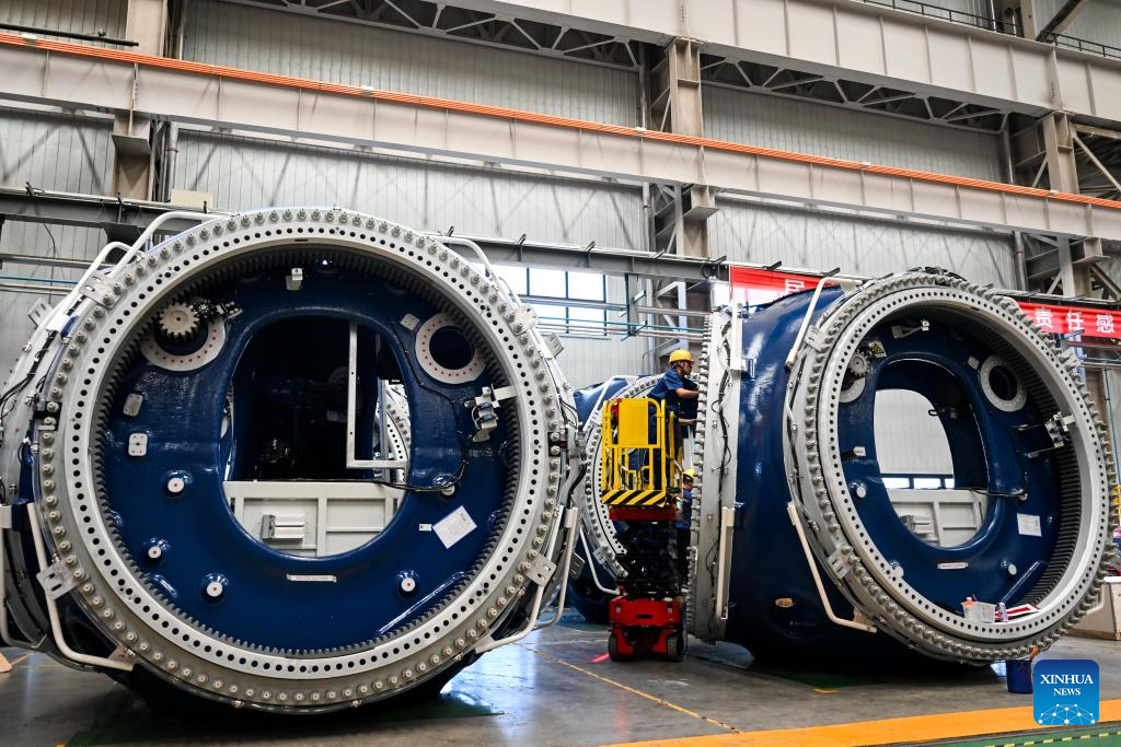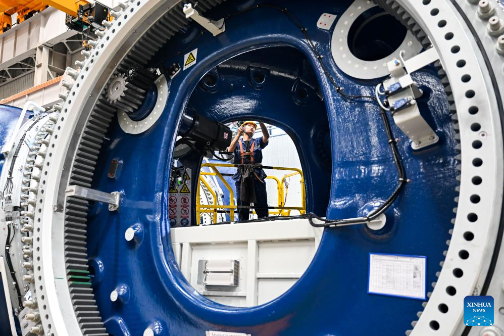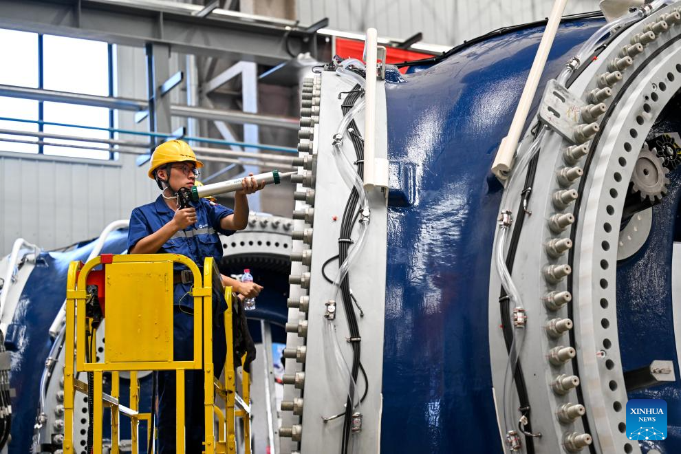 A worker is busy at the general assembly workshop in the Mingyang New Energy Intelligent Manufacturing Industrial Park in Baotou, north China's Inner Mongolia Autonomous Region, July 29, 2025.