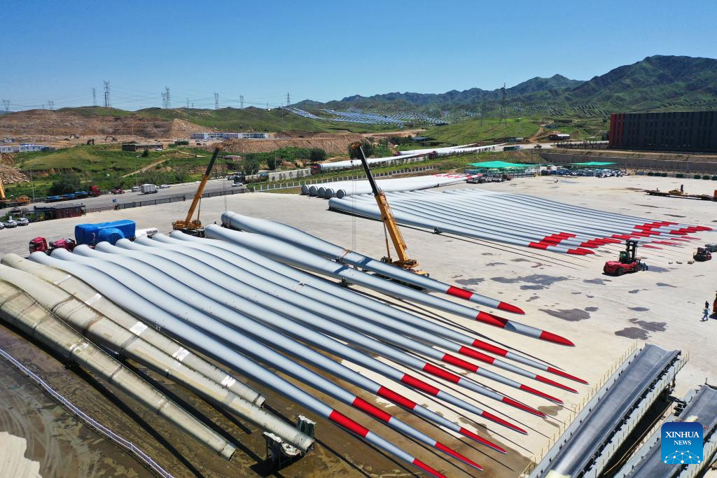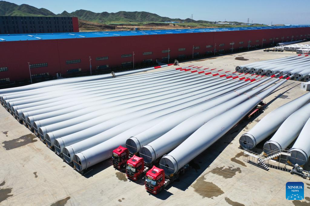 A drone photo shows wind turbine blades at the Mingyang New Energy Intelligent Manufacturing Industrial Park in Baotou, north China's Inner Mongolia Autonomous Region, July 29, 2025.