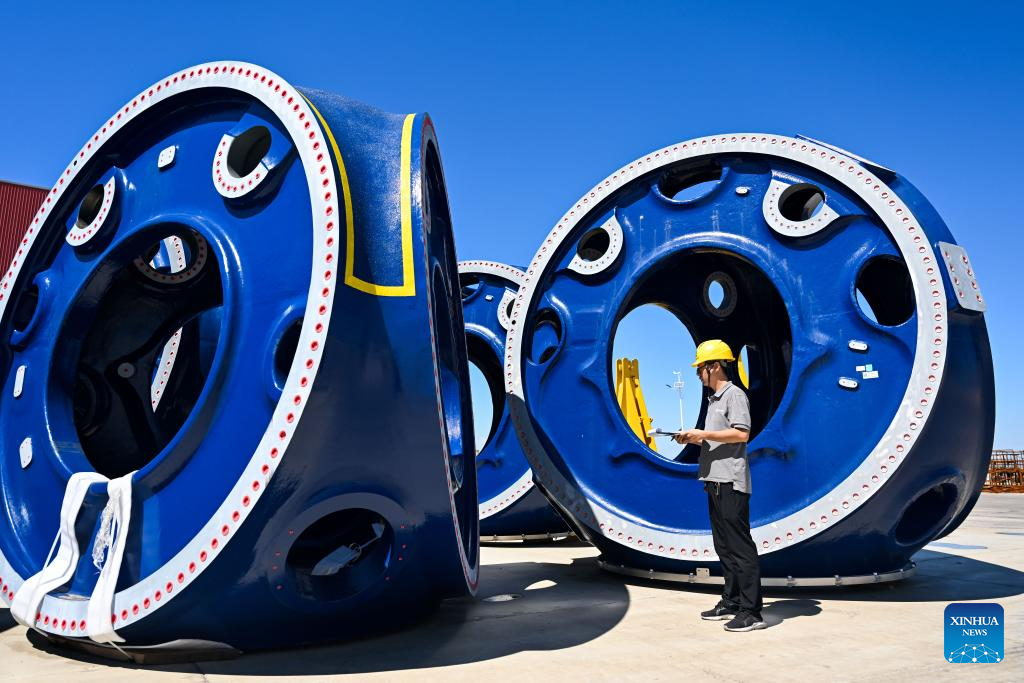 A worker checks wind turbine components at the Mingyang New Energy Intelligent Manufacturing Industrial Park in Baotou, north China's Inner Mongolia Autonomous Region, July 29, 2025.