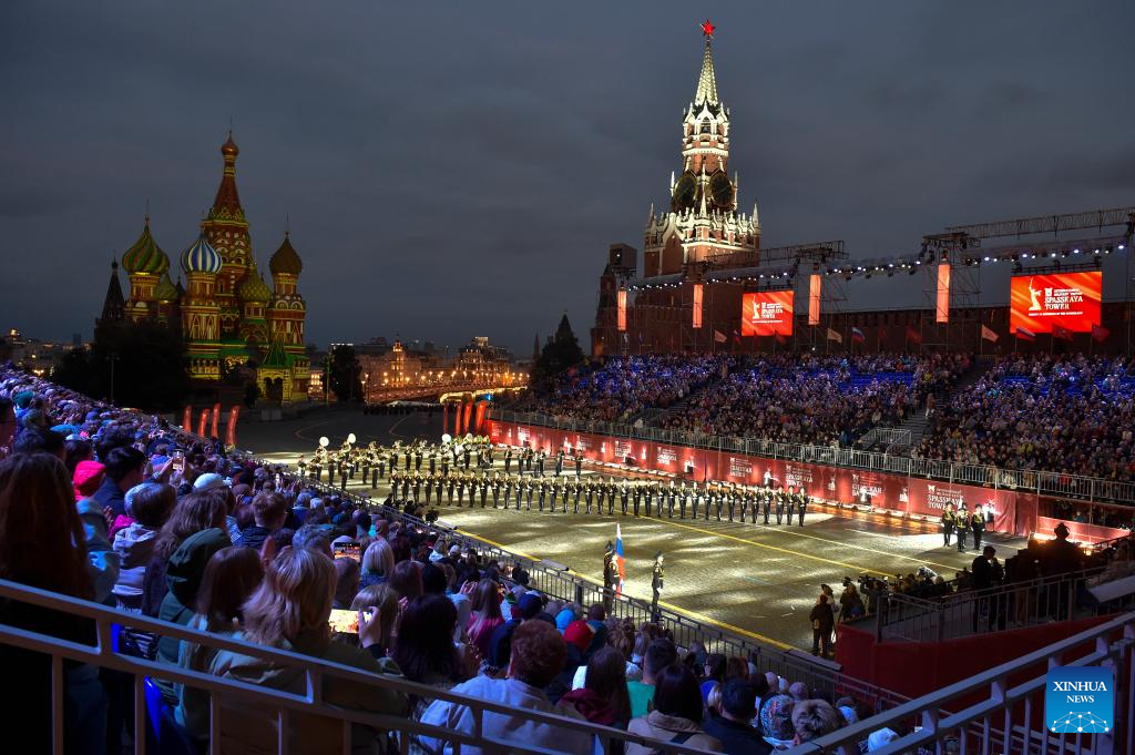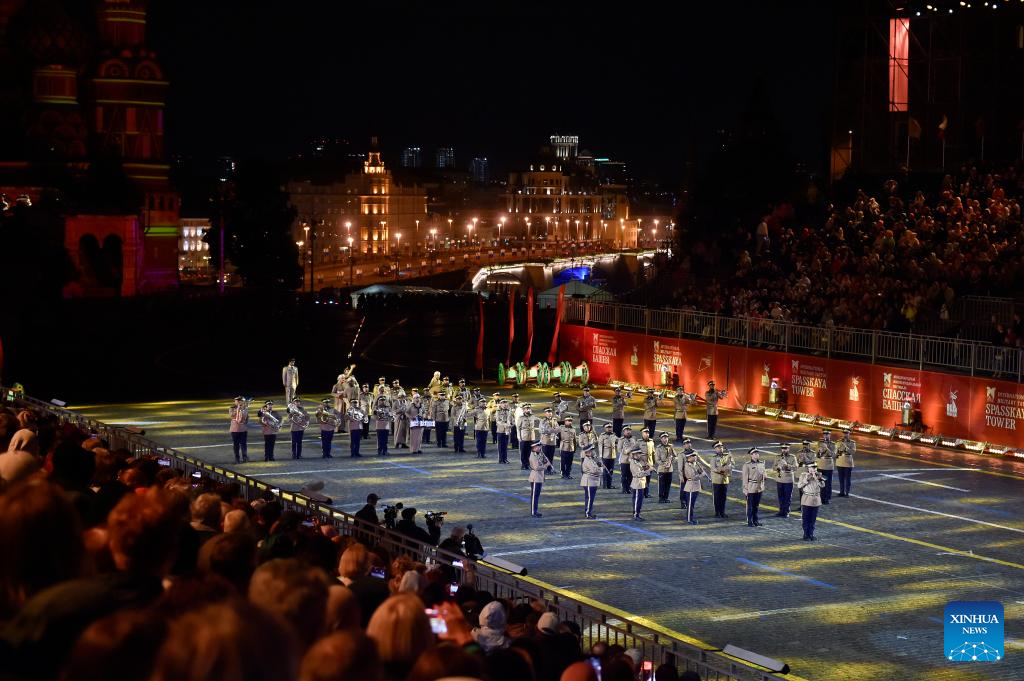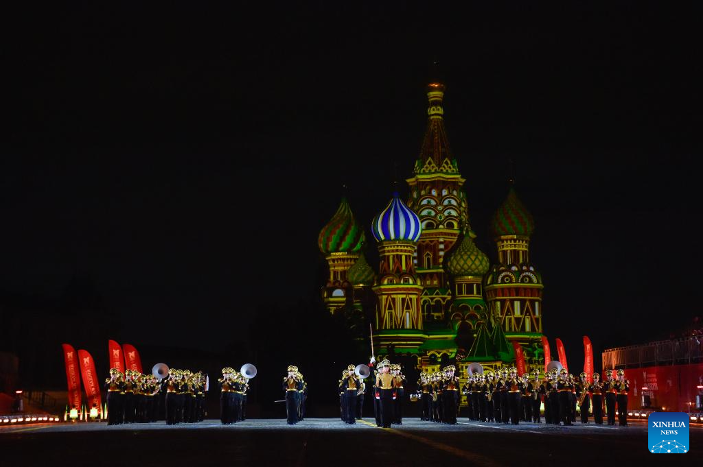 A military band performs at the "Spasskaya Tower" International Military Music Festival in Moscow, Russia, Aug. 22, 2025.