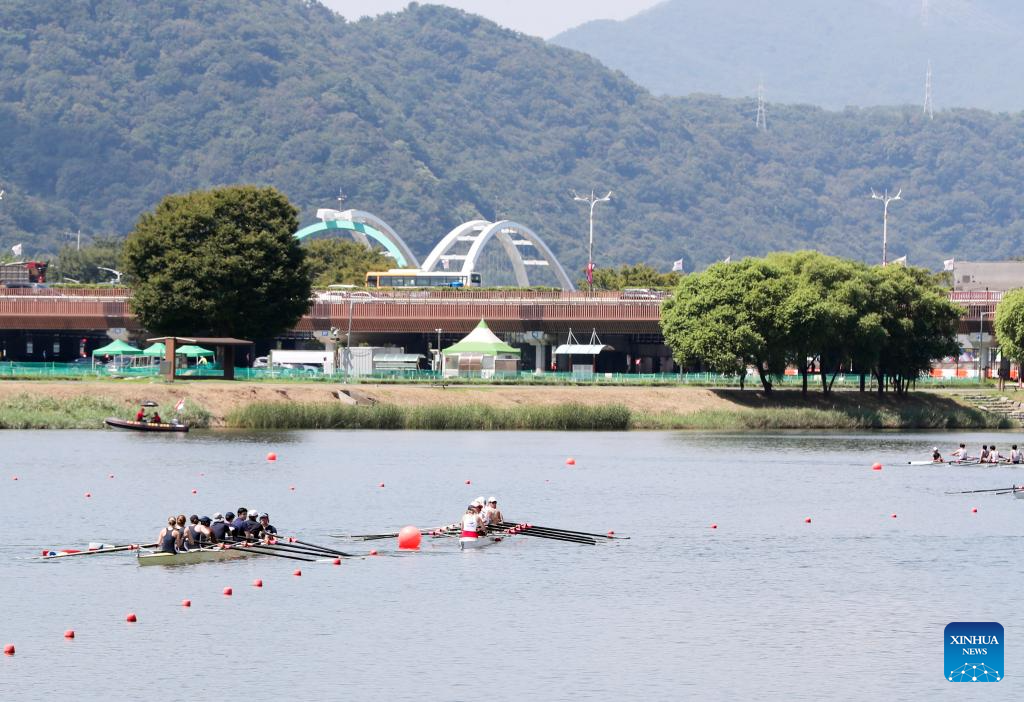 Rowing teams from various universities participate in a rowing competition in Ulsan, South Korea, Aug. 23, 2025. Ulsan, located in southeastern South Korea, has a population of over one million and is a renowned port city. (Xinhua/Yao Qilin)