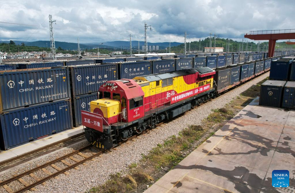 An international freight train bound for Lao capital Vientiane prepares to depart from Yanhe Station of China-Laos Railway in Yuxi City, southwest China's Yunnan Province, Aug. 23, 2025. The China-Laos Railway launched two-way operations of the international freight train service between Yuxi and Vientiane on Saturday. Since its inauguration in December 2021, the China-Laos Railway has transported over 64.5 million tonnes of goods by the end of July this year, including more than 14.9 million tonnes of cross-border cargo. (Xinhua/Chen Xinbo)