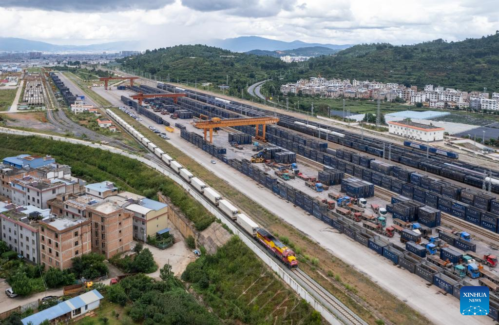 An aerial drone photo taken on Aug. 23, 2025 shows an international freight train, which departed from Lao capital Vientiane, at Yanhe Station of China-Laos Railway in Yuxi City, southwest China's Yunnan Province. The China-Laos Railway launched two-way operations of the international freight train service between Yuxi and Vientiane on Saturday. Since its inauguration in December 2021, the China-Laos Railway has transported over 64.5 million tonnes of goods by the end of July this year, including more than 14.9 million tonnes of cross-border cargo. (Xinhua/Chen Xinbo)