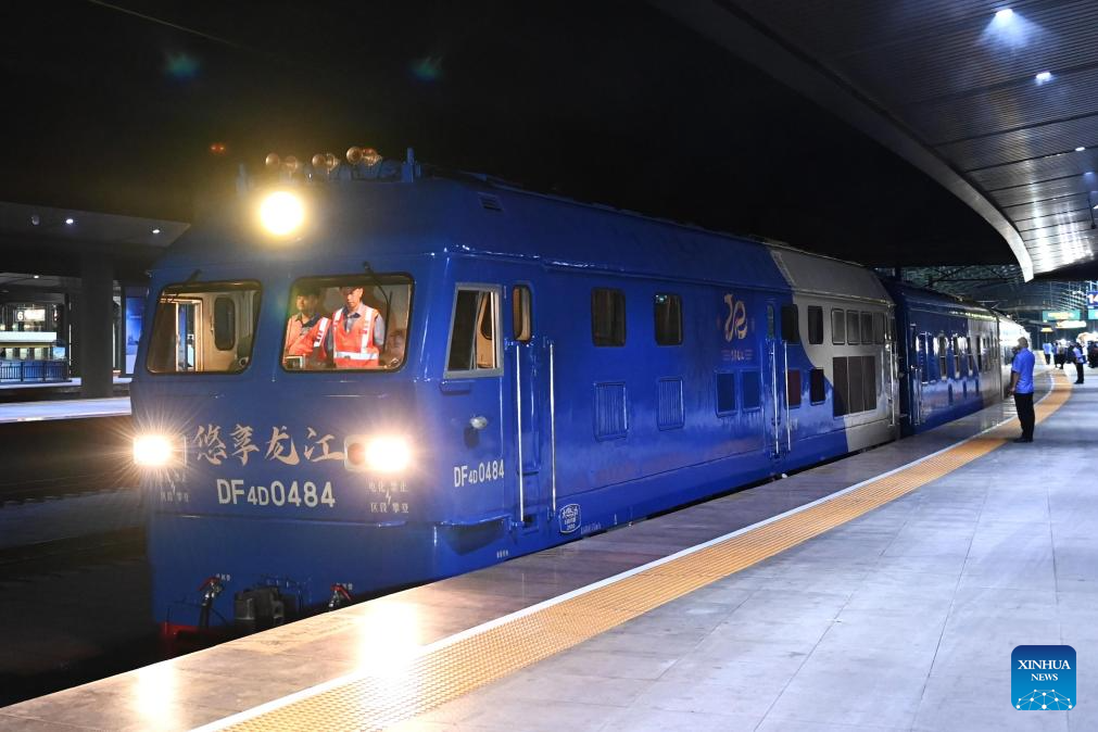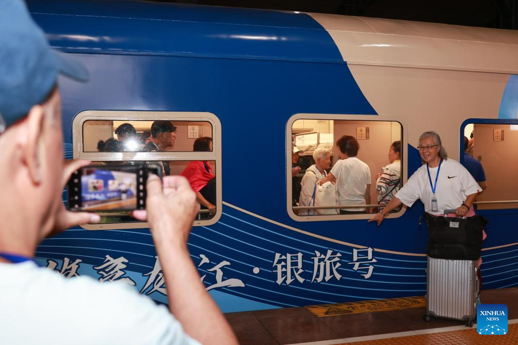 A tourist train for senior citizens departs from Harbin Railway Station in Harbin, northeast China's Heilongjiang Province, Aug. 22, 2025. A tourist train with elderly-friendly modifications departed from Harbin for a five-day grassland trip on Friday. (Photo by Yuan Yong/Xinhua)