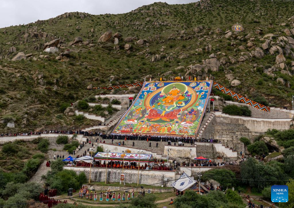 A ritual marking the start of the Shoton Festival is held at the Drepung Monastery in Lhasa, southwest China's Xizang Autonomous Region, Aug. 23, 2025. Celebrations marking the traditional Shoton Festival began in Lhasa on Saturday. (Xinhua/Tenzing Nima Qadhup)