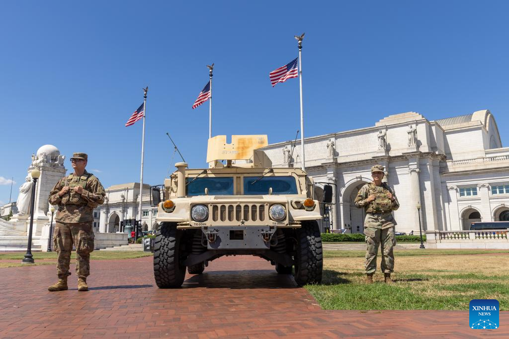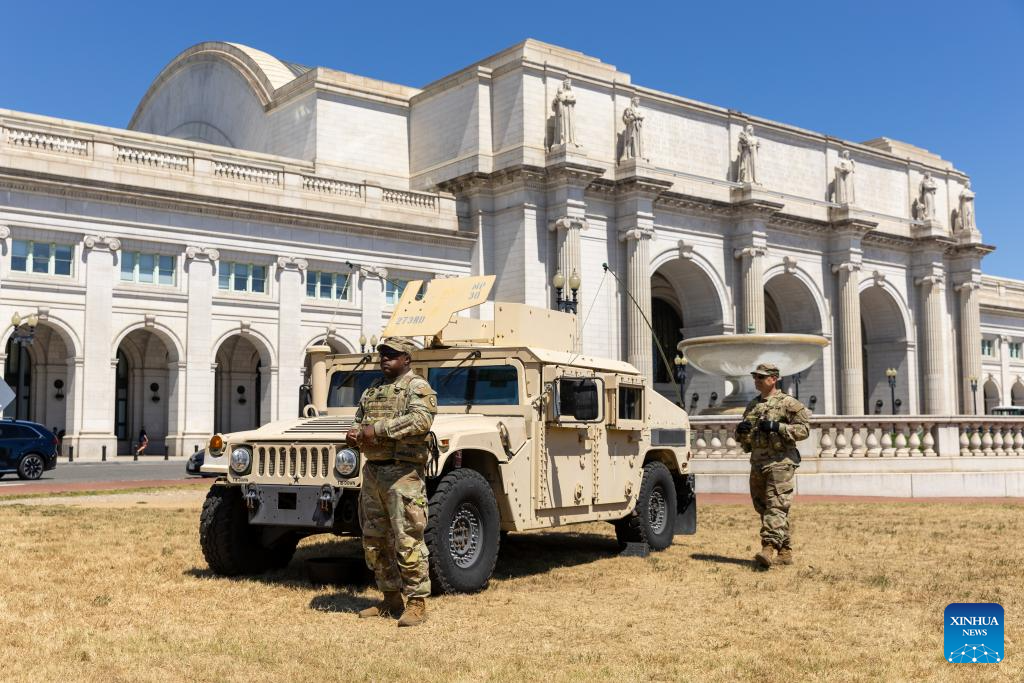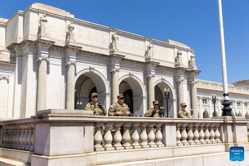 Members of the National Guard stand guard at Union Station in Washington, D.C., the United States, on Aug. 22, 2025. (Xinhua/Hu Yousong)