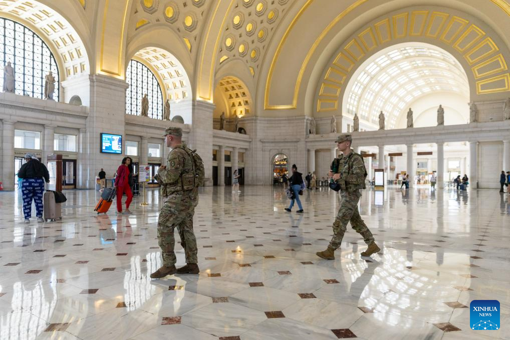 Members of the National Guard patrol inside Union Station in Washington, D.C., the United States, on Aug. 22, 2025. (Xinhua/Hu Yousong)