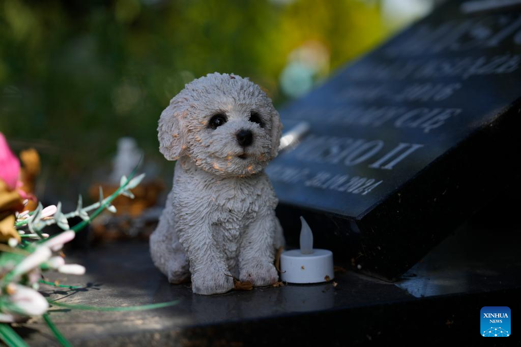 A tombstone is pictured at the "Dog's Fate" pet cemetery in Nowy Konik, Poland, Aug. 22, 2025. Founded in 1991, "Dog's Fate" is the country's first pet cemetery, providing a resting place for thousands of dogs, cats, and other small animals. (Photo by Jaap Arriens/Xinhua)