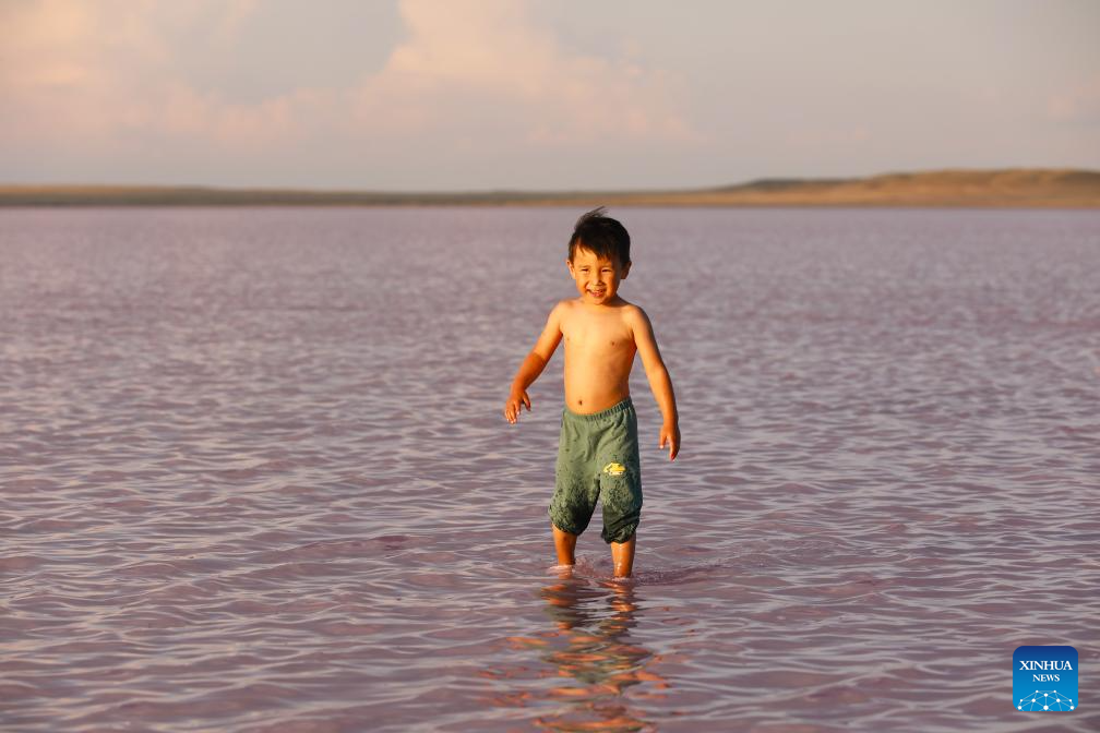 A boy enjoys himself at Kobeytuz Lake in Akmola Region, Kazakhstan, Aug. 23, 2025. Kobeytuz Lake is renowned for its pink hues. Due to limited tourism capacity and environmental concerns, Kobeytuz Lake was closed to the public after 2020 for ecological restoration. According to Kazinform News Agency, the lake has reopened to visitors starting from the summer of 2025. (Photo by Kalizhan Ospanov/Xinhua)