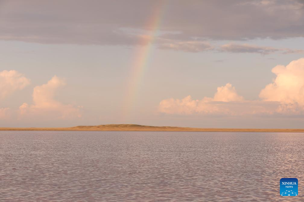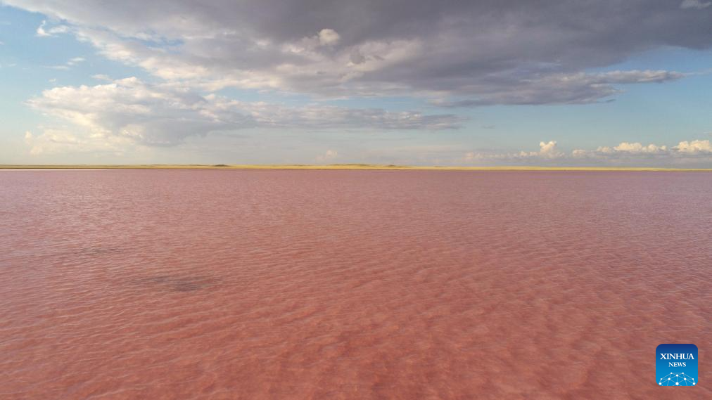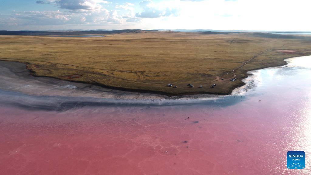 This photo taken on Aug. 23, 2025 shows the view of Kobeytuz Lake in Akmola Region, Kazakhstan. Kobeytuz Lake is renowned for its pink hues. Due to limited tourism capacity and environmental concerns, Kobeytuz Lake was closed to the public after 2020 for ecological restoration. According to Kazinform News Agency, the lake has reopened to visitors starting from the summer of 2025. (Photo by Kalizhan Ospanov/Xinhua)