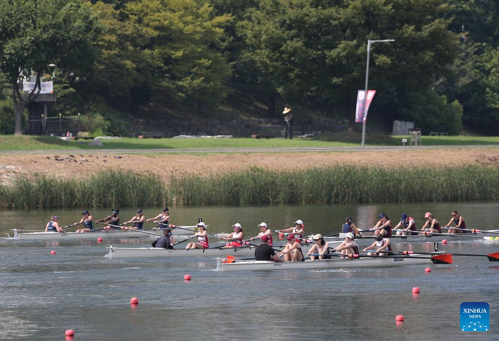 Participants take part in a women's rowing competition on the Taehwa River in Ulsan, South Korea, Aug. 24, 2025. Teams of students from universities including Peking University, Oxford University, the University of Tokyo, and Yale University participated in the 2025 Ulsan World-Class University Rowing Festival held in Ulsan, South Korea from August 23 to 24. (Xinhua/Yao Qilin)