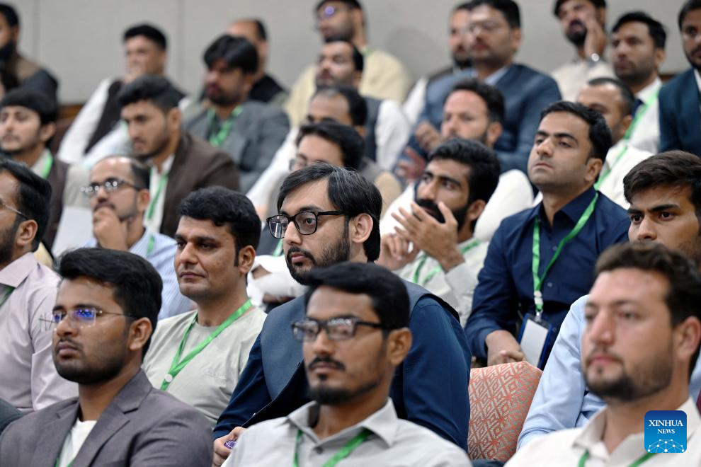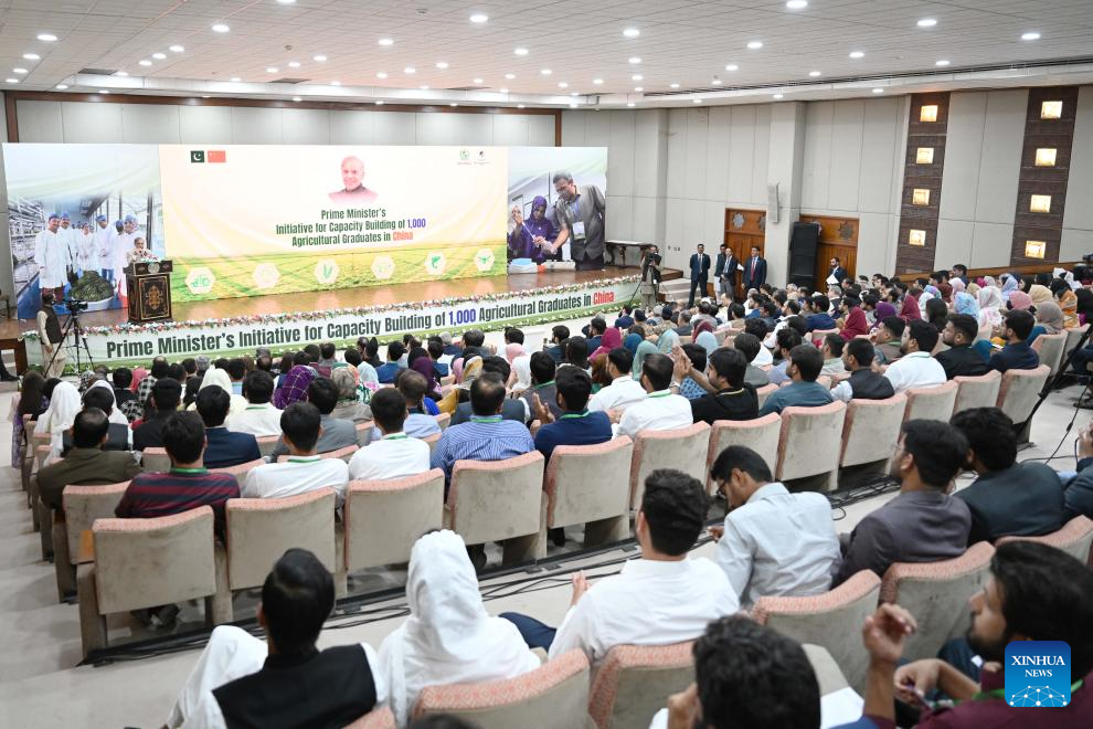 Students attend a farewell ceremony for the second batch of 300 students under the Prime Minister's Initiative for Capacity Building of 1,000 Agricultural Graduates in China, in Islamabad, Pakistan, Aug. 22, 2025. Pakistani Prime Minister Shehbaz Sharif on Friday encouraged the country's young agricultural graduates leaving for China to learn modern Chinese practices to help transform Pakistan's farming sector. (Photo by Ahmad Kamal/Xinhua)